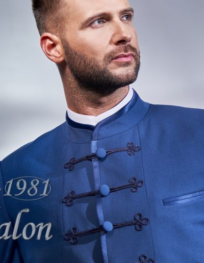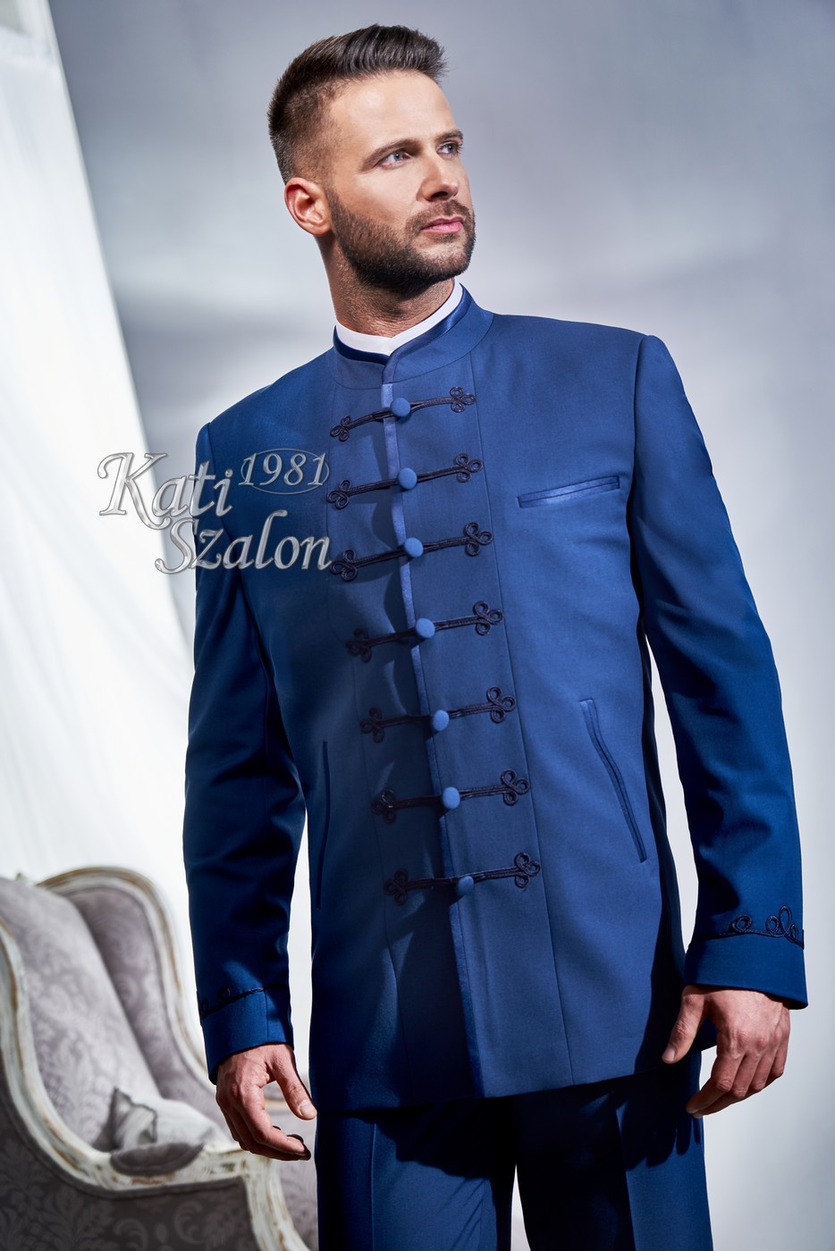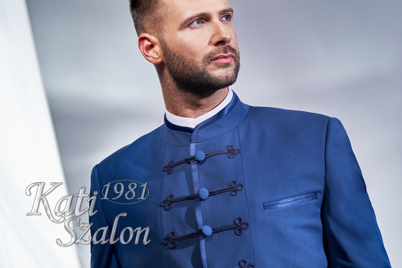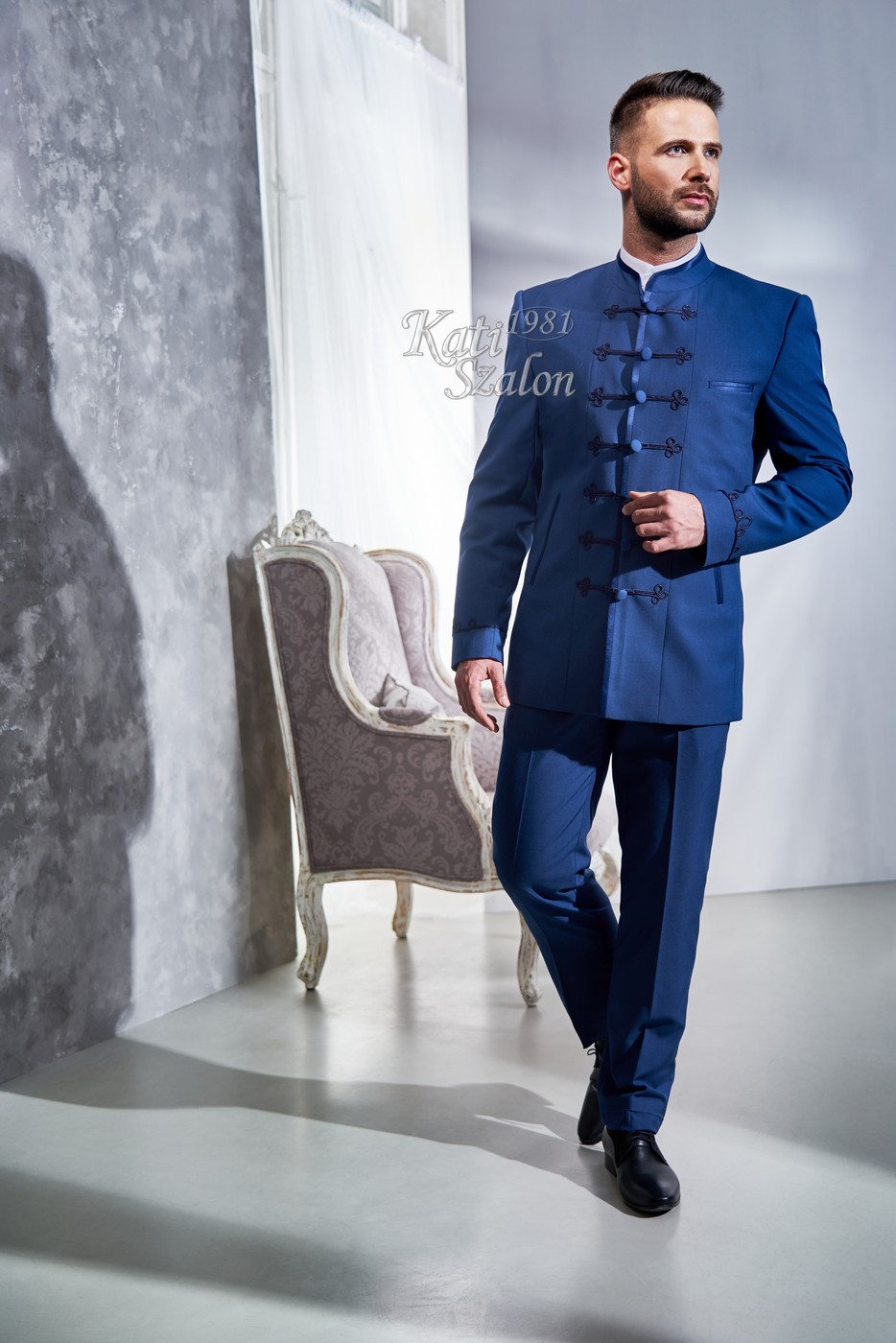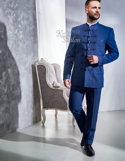 Egyedi tervezésű bocskai öltöny. Modern és hagyományos is egyben az állógalléros öltöny. Fiatalos szabásvonal, szatén szegés és hagyományos 3 hurkos sujtás jellemzi.