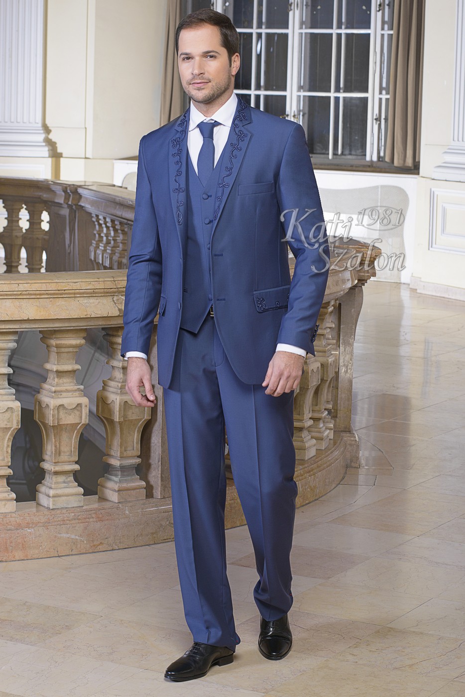 Gyapjú öltöny klasszikus 2 gombos fazonban. Különlegessége a gallér és zseb sujtás díszítése. Több színben is rendelhető.