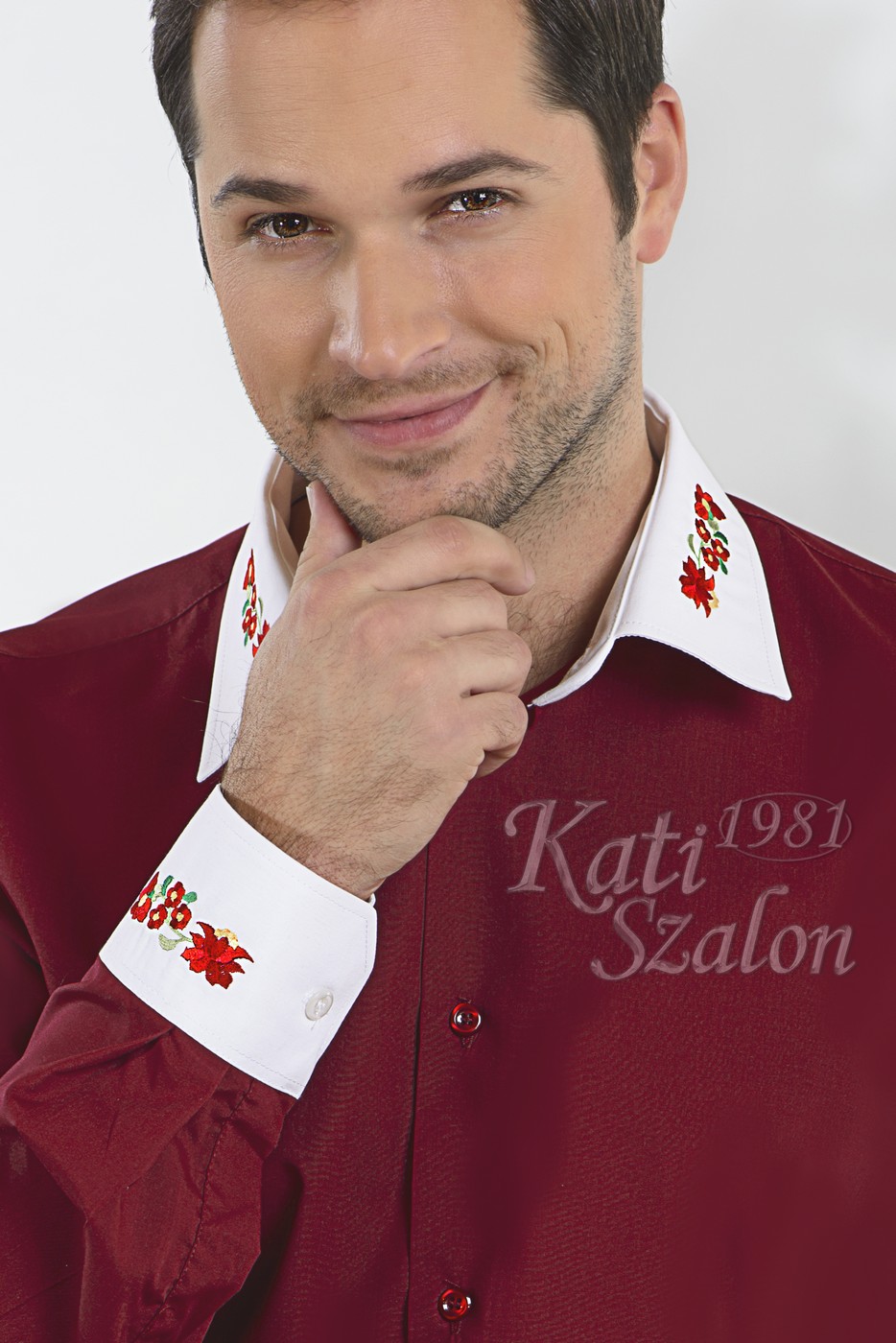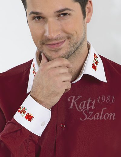 Bordó ing, fehér gallérján és mandzsettáján kalocsai hímzéssel