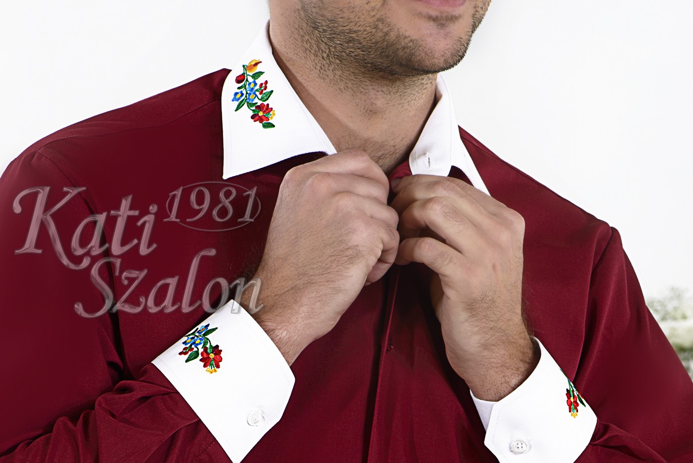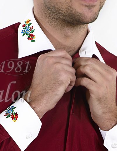 Bordó ing, fehér gallérján és mandzsettáján kalocsai hímzéssel