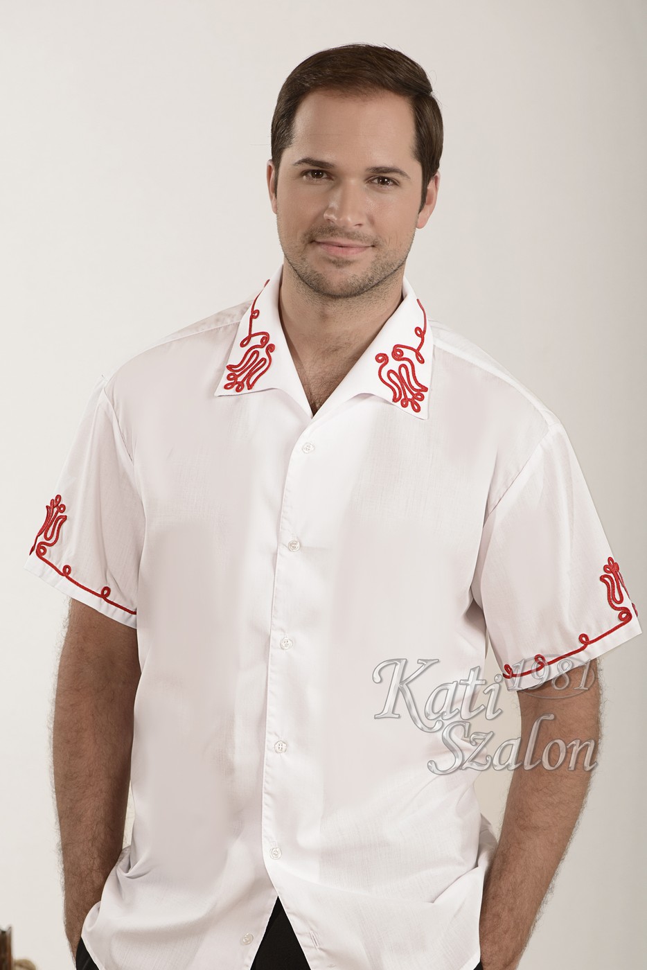 Piros zsinórozással készült férfi ing, kihajtós gallérral, rövid ujjal