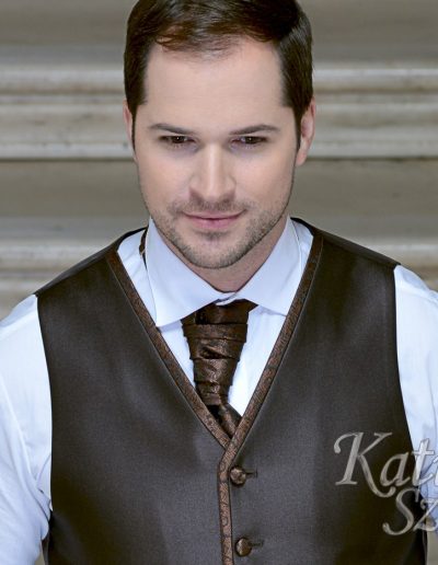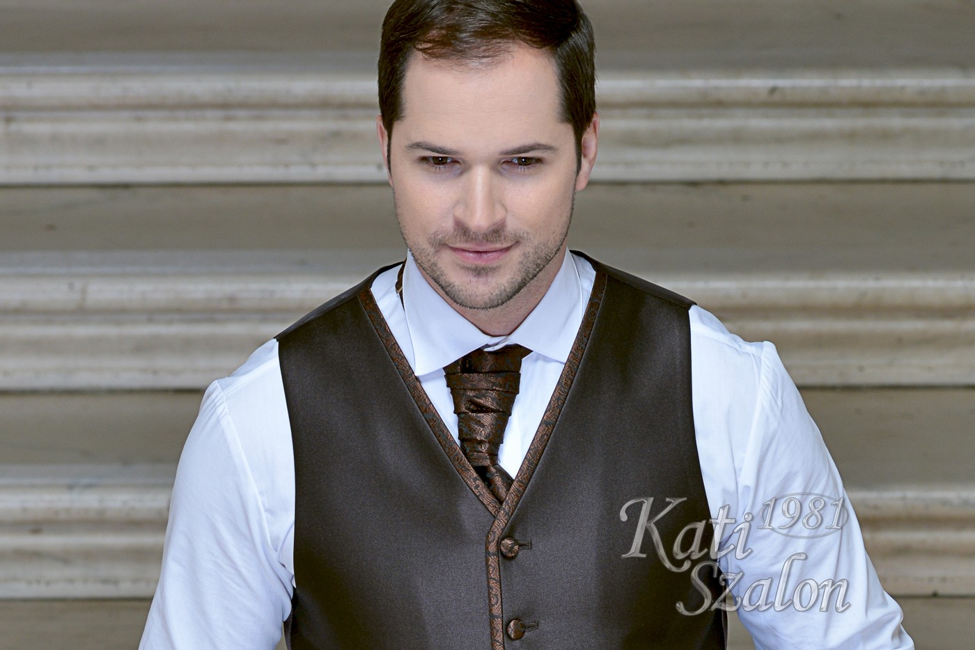 Barna mellény vékony brokát díszítéssel, francia nyakkendővel.