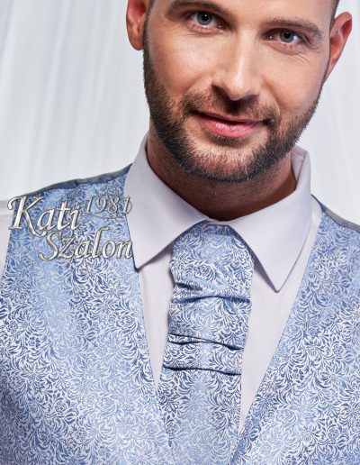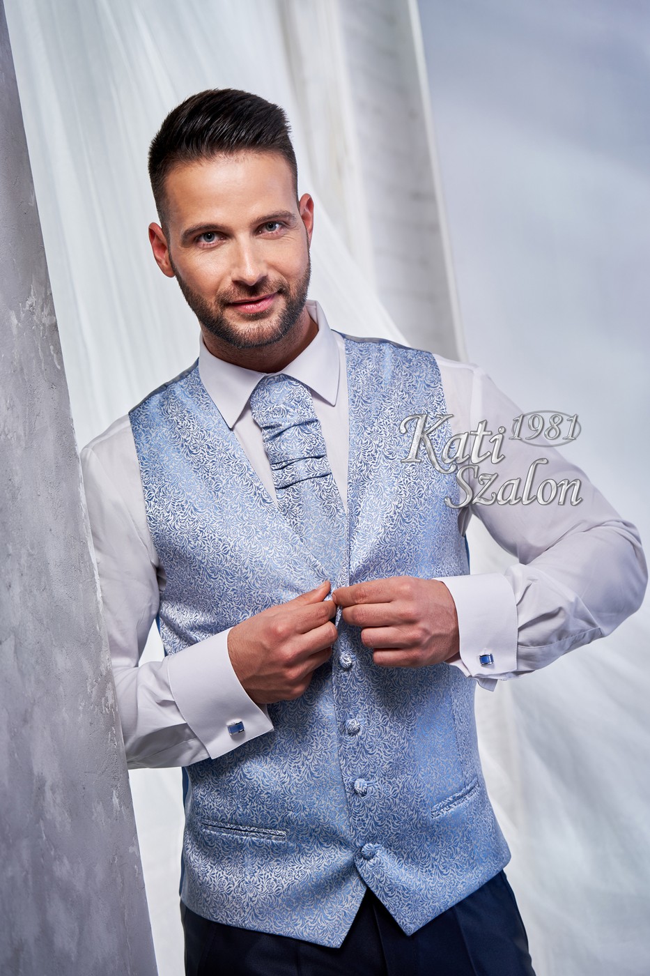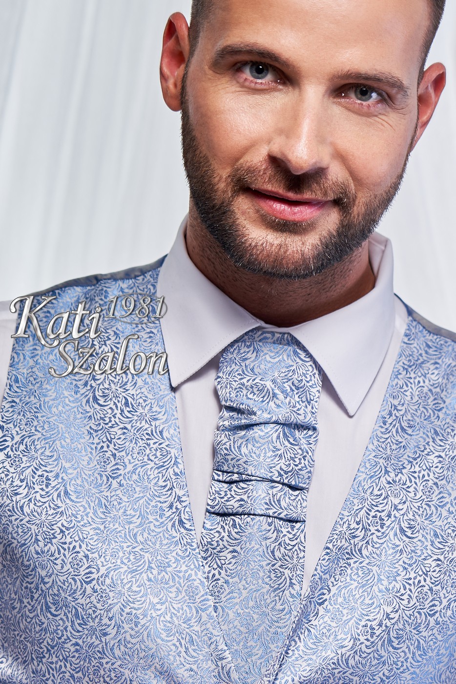 Világoskék önmagában mintás, elegáns brokát mellény, hozzá illő francia nyakkendővel és díszzsebkendővel.