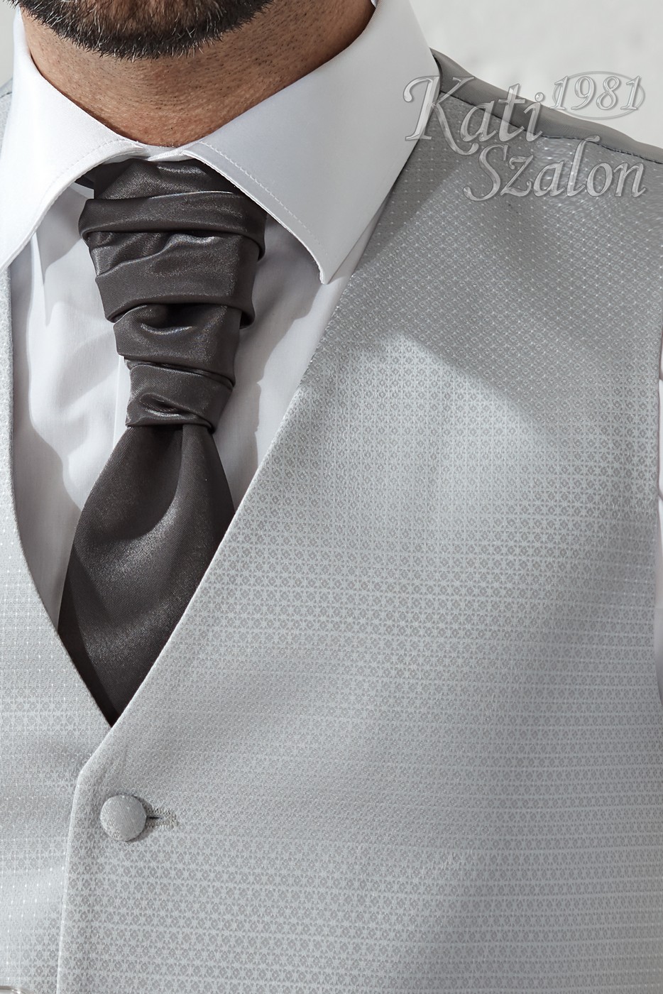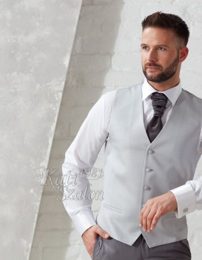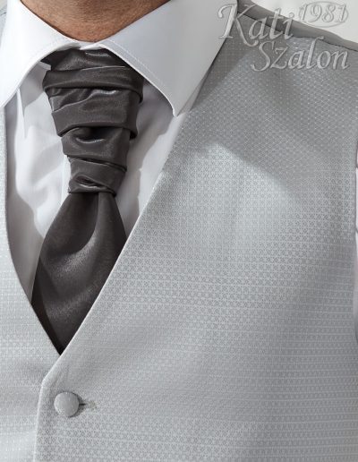 Világos szürke apró mintás férfi mellény, francia nyakkendővel, díszzsebkendővel.