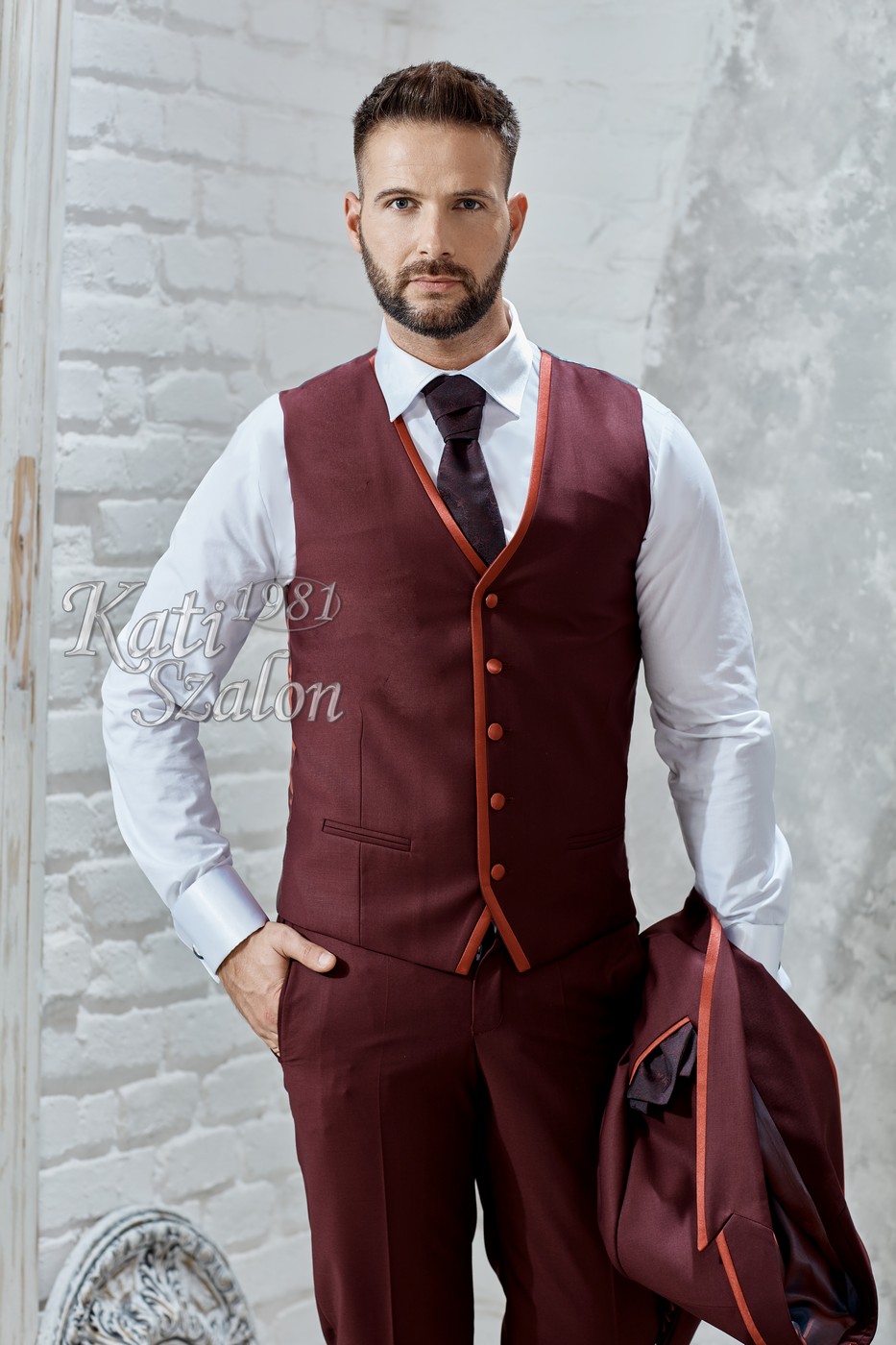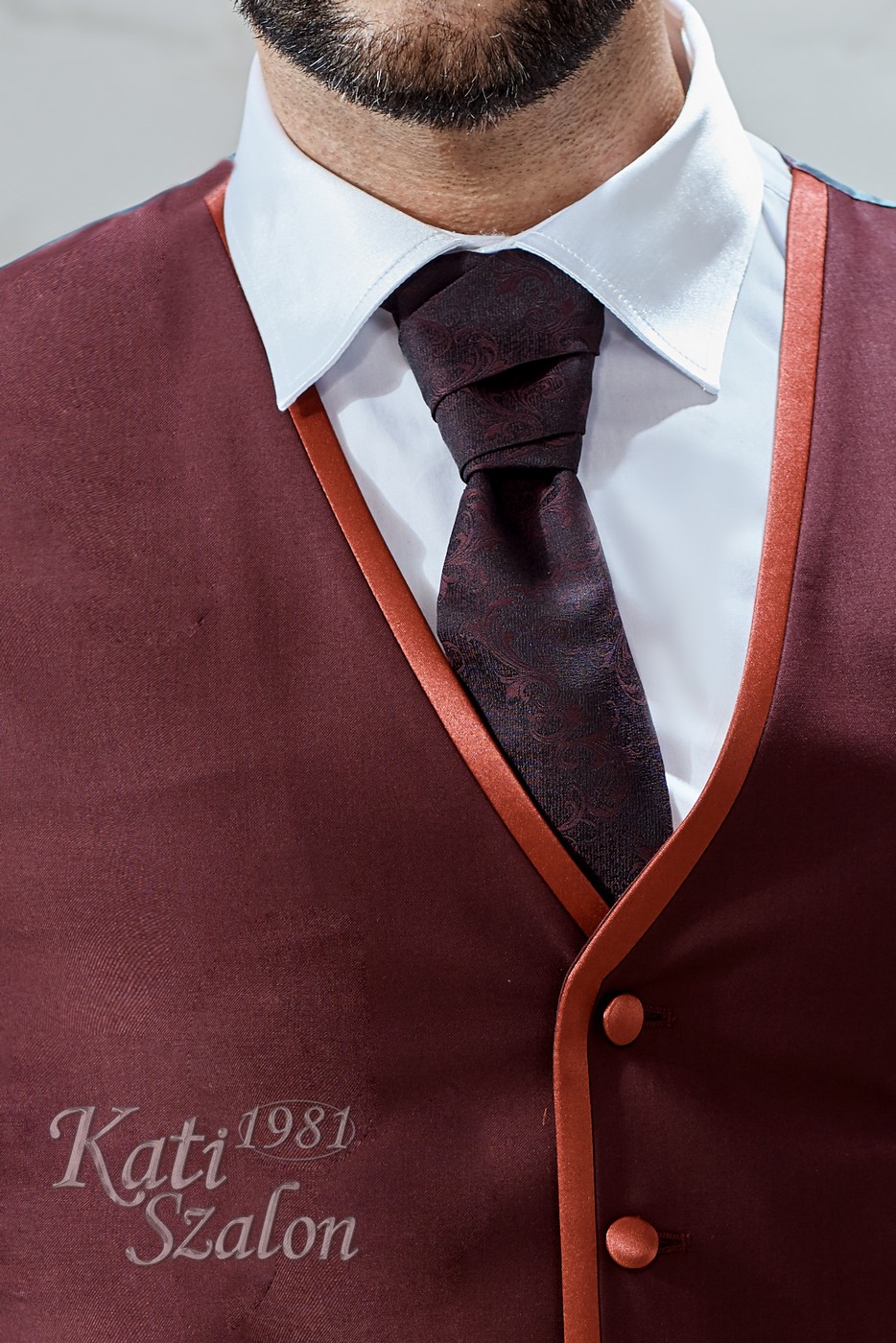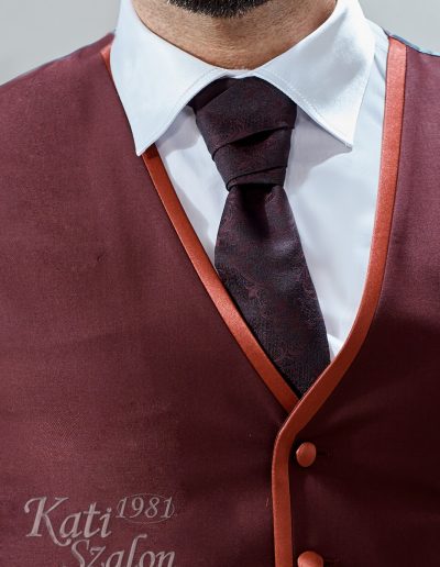 Burgundi gyapjú mellény, szatén szegéssel, mintás brokát nyakkendővel és díszzsebkendővel.