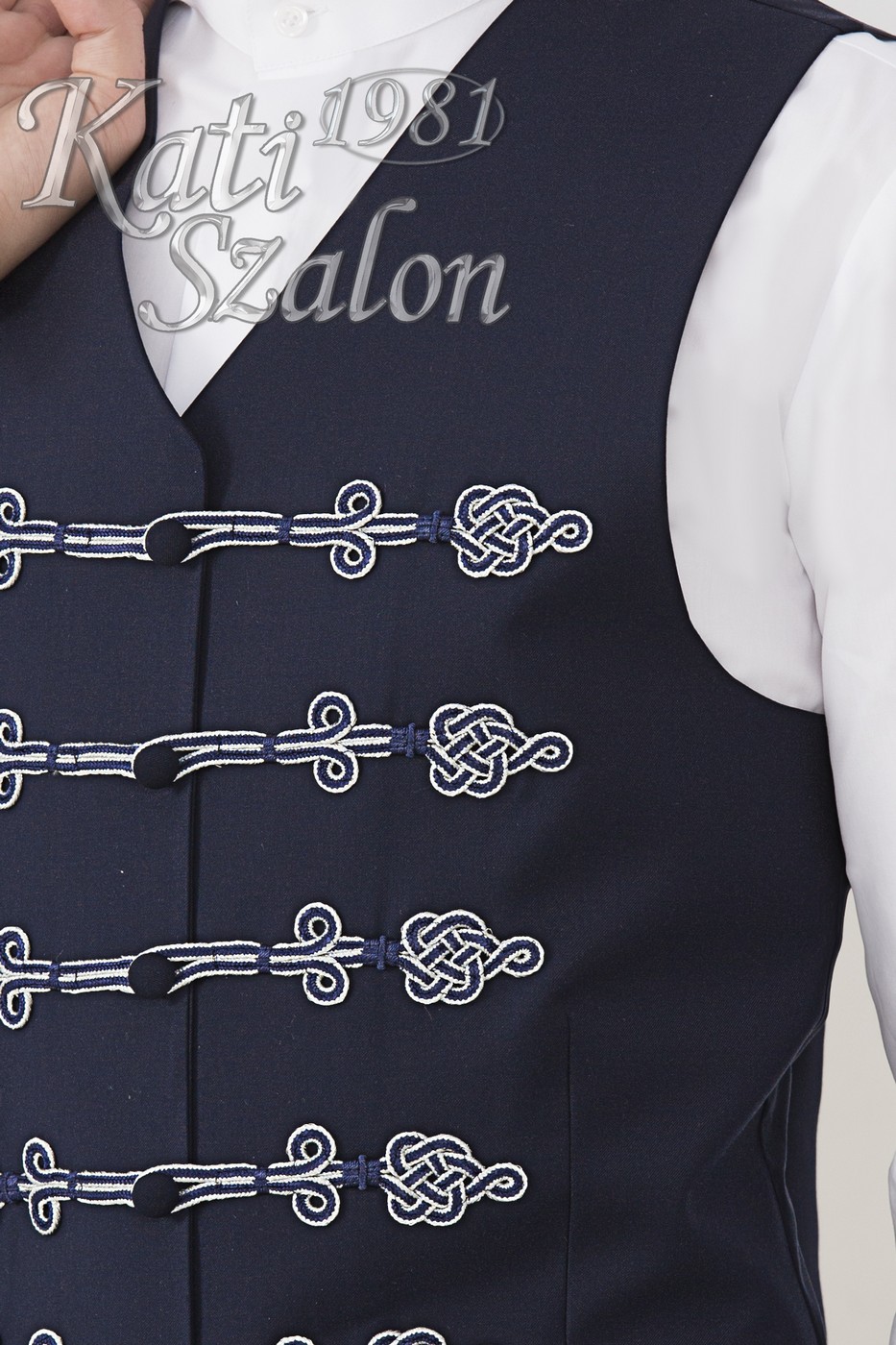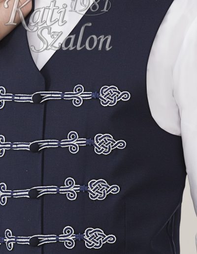 Díszmagyar bocskai mellény. Sötétkék gyapjú anyagból készült, 2 színű kék-ezüst kézi kikötésű vitézkötés díszíti.