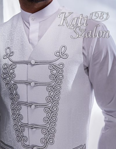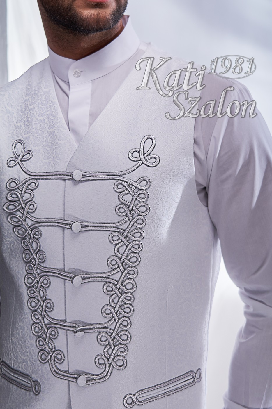 Hófehér önmagában mintás szatén mellény, ezüst-fehér különleges, 2 színű sujtással