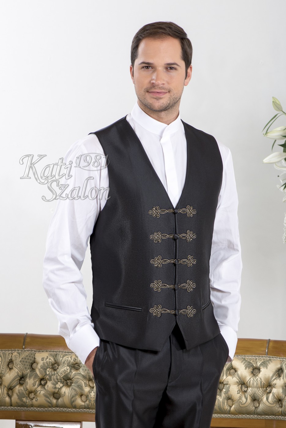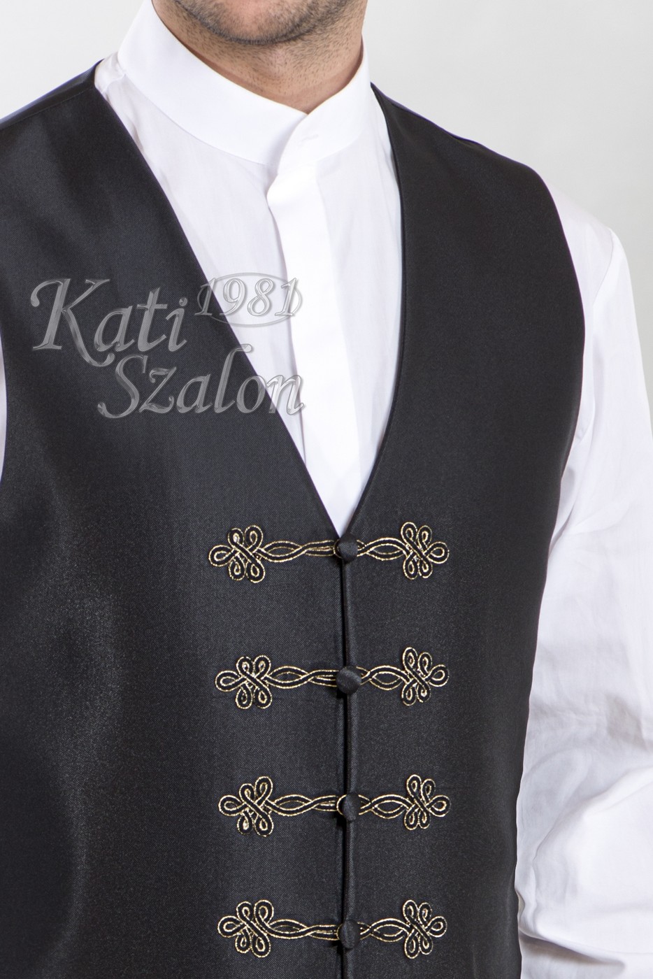 Fekete fényes anyagú mellény, 5 pár fekete-arany sujtásmotívummal gombolódik
