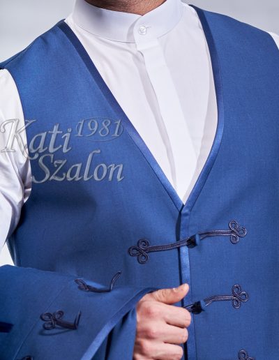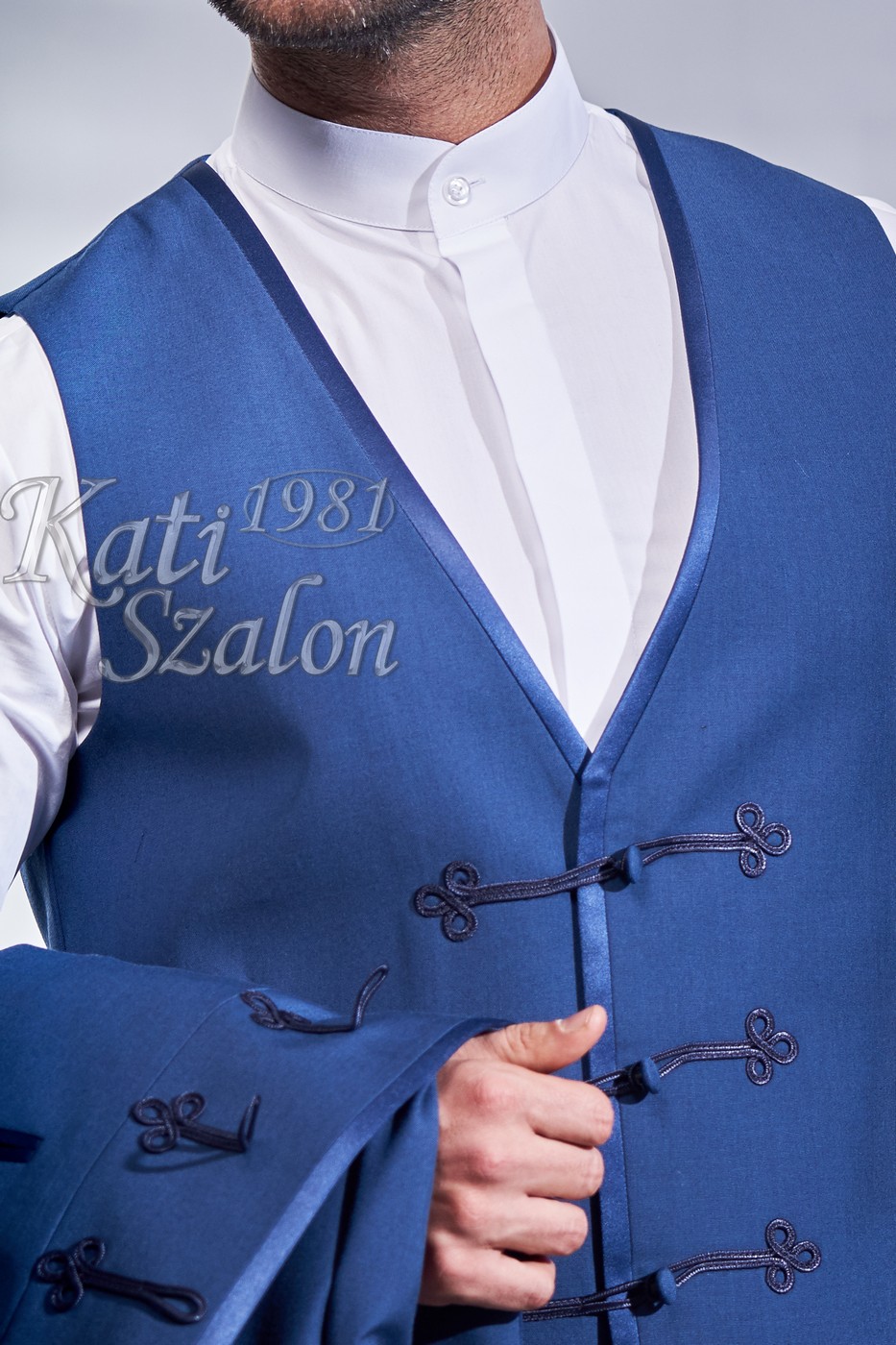 Kék gyapjúból készült mellény, szatén szegéssel, 3 gombolóval záródik