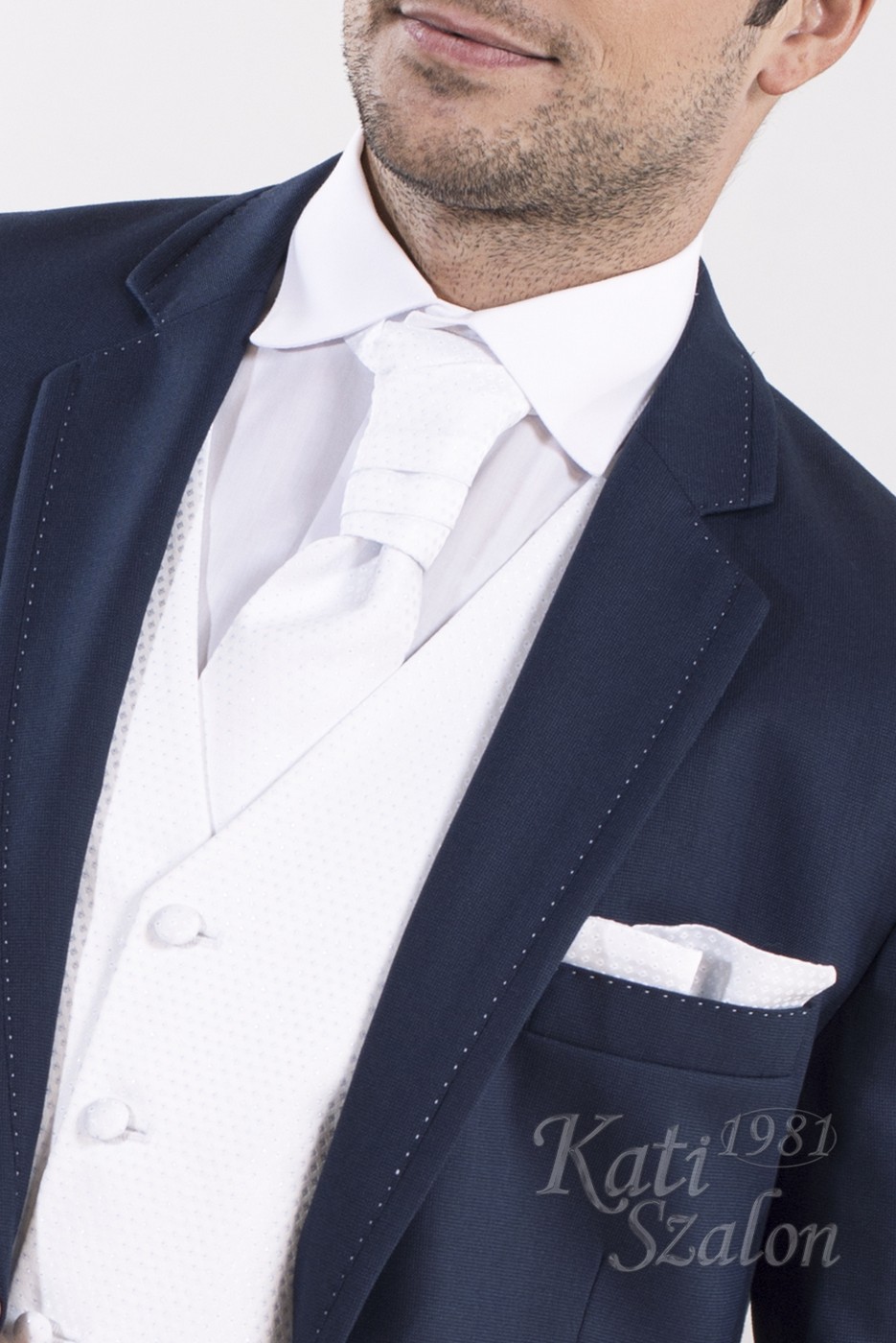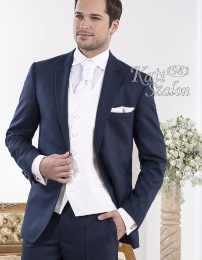 2 gombos férfi öltöny, fehér színű dísztűzéssel a galléron, bezecen. Egyszerű, elegáns öltözék.