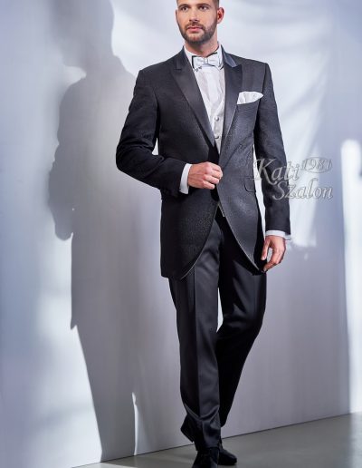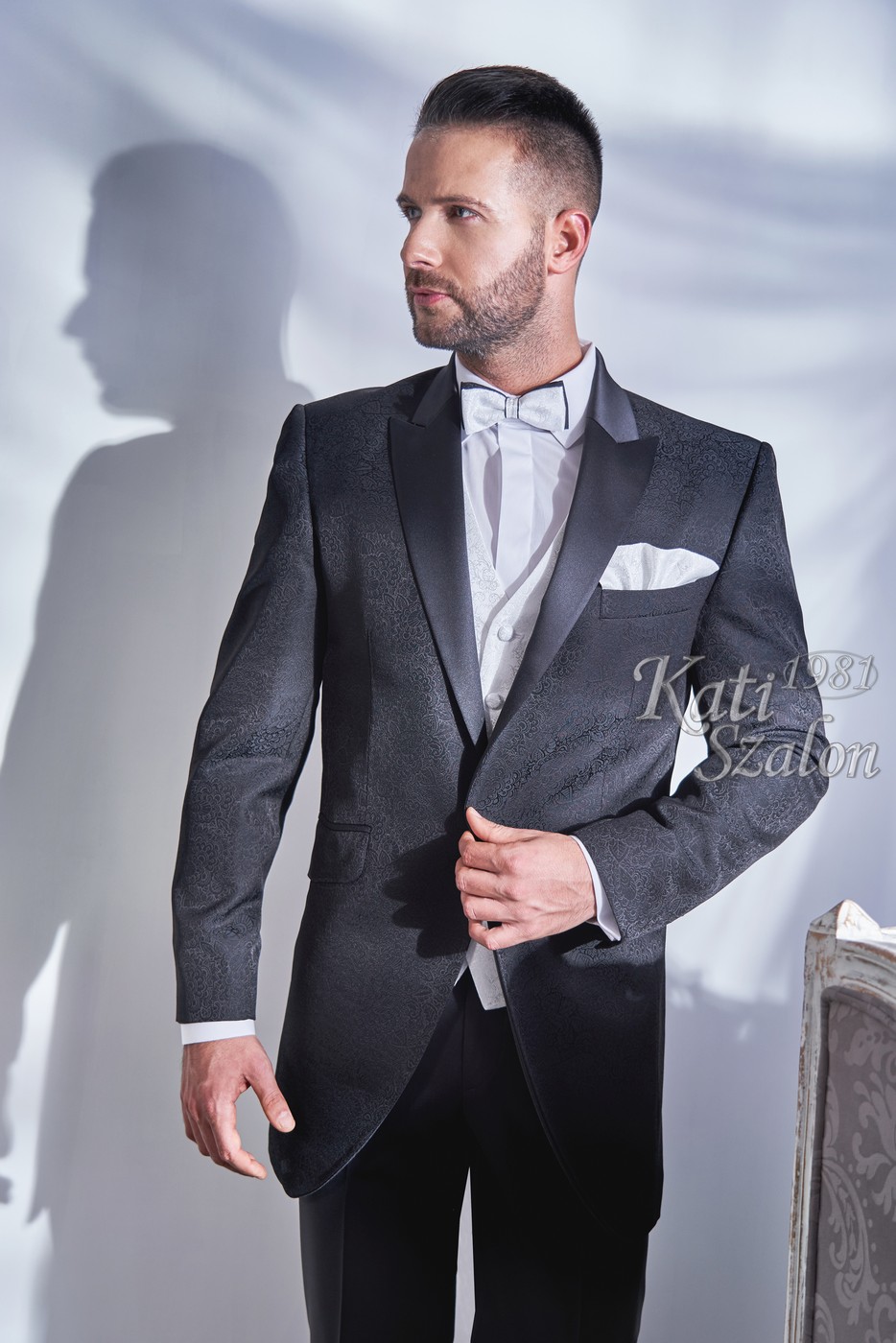 Magában mintás fekete brokátból készült 1 gombos, hosszított fazonú öltöny, zsakett. Elegáns szatén gallér és bezec. Csokornyakkendővel és mellénnyel különleges vőlegény öltözet.