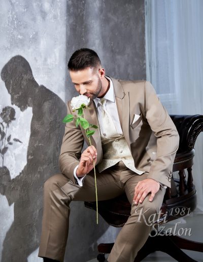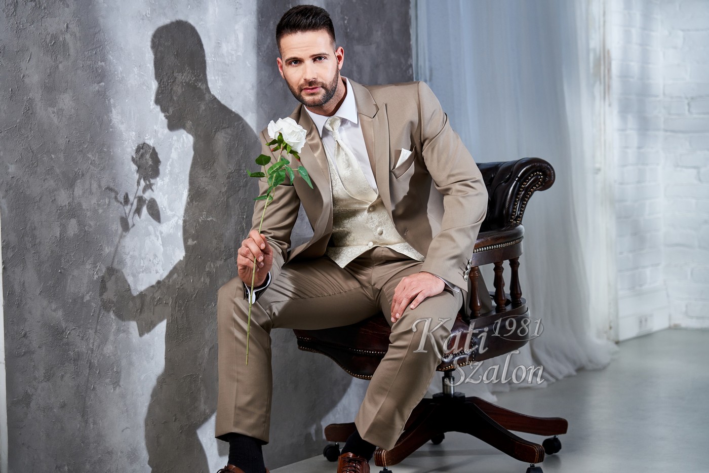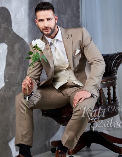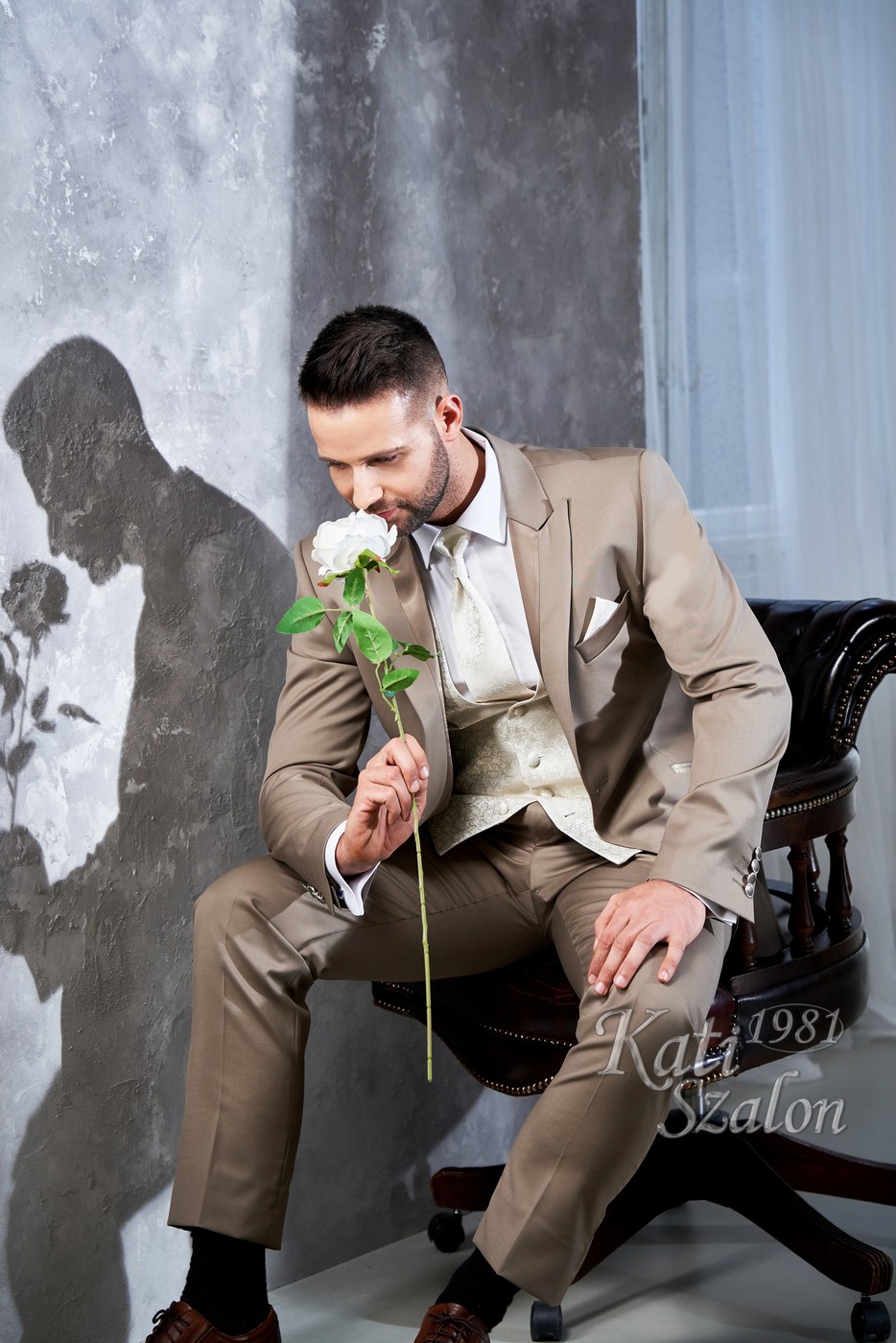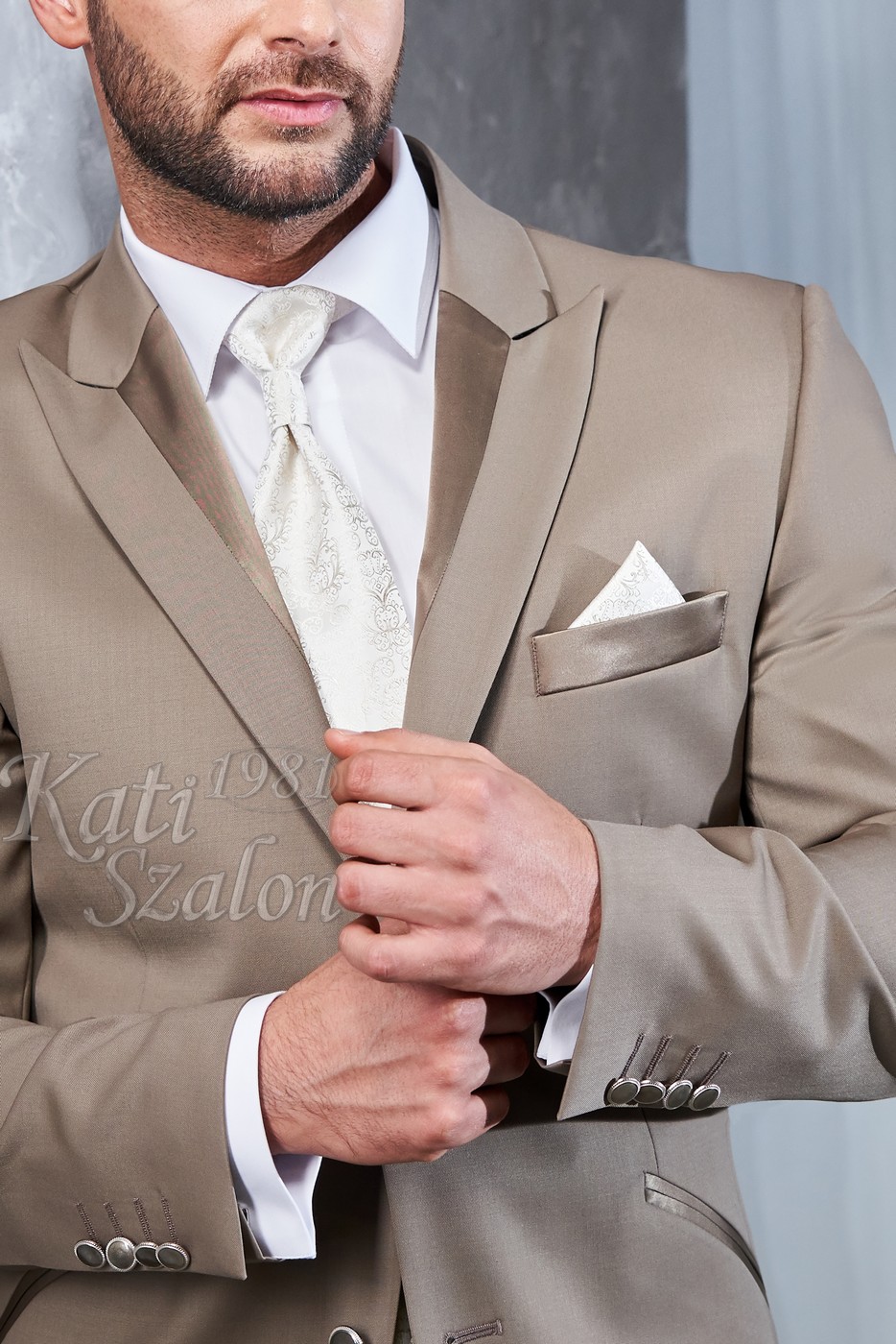 Elegáns vőlegény öltöny, 1 gombos fazonban. Különlegessége a szabott bezec, szaténnal díszítve. Csokornyakkendővel, spanyolövvel és ceremóniamellénnyel is elegáns.