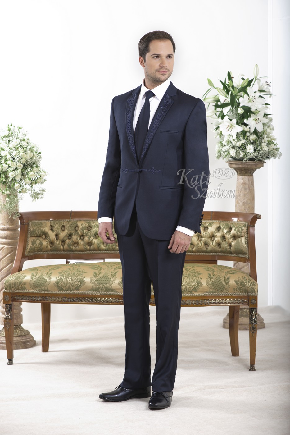 Hagyományos fazonú 1 gombos gyapjú férfi öltöny, egyedi zsinóros díszítéssel.