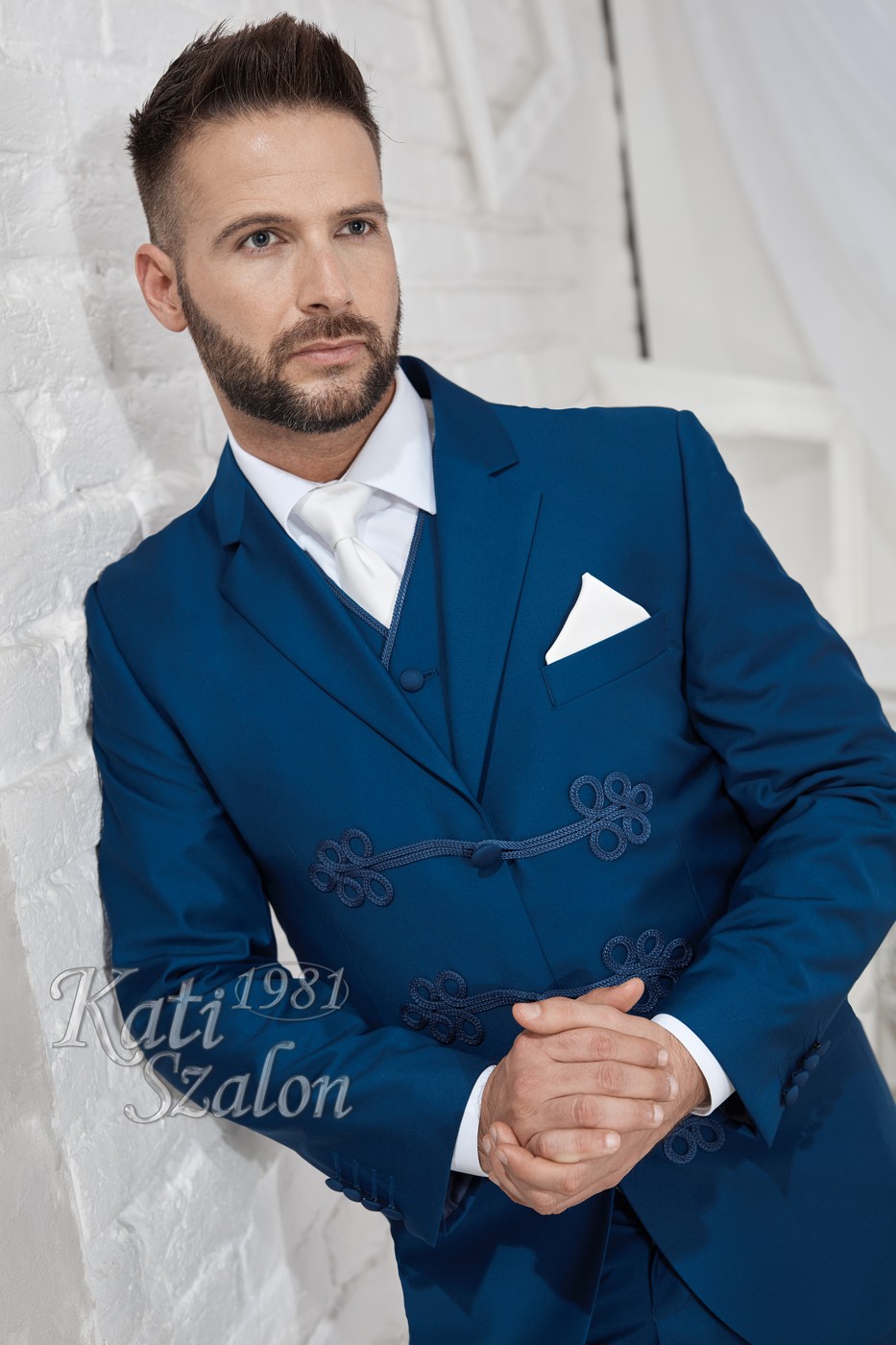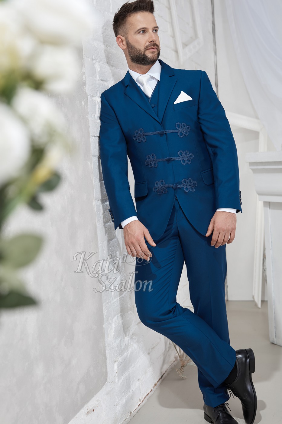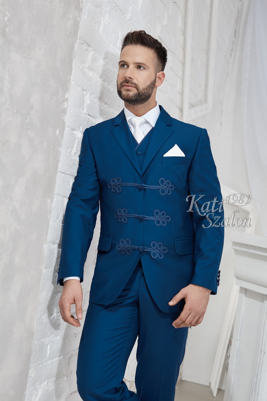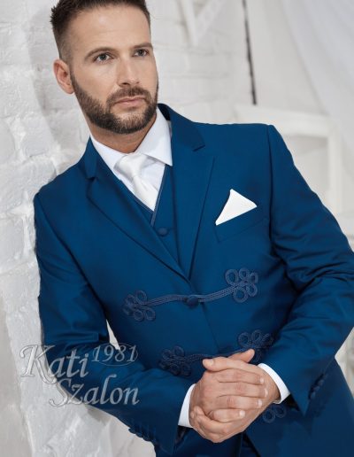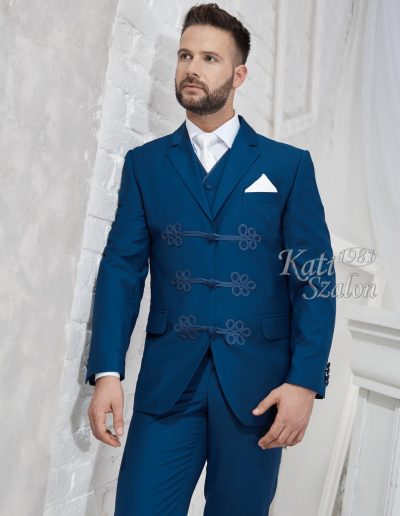 Középkék klasszikus 3 gombos zsinóros öltöny. Különlegessége a hagyományos zsinórgomboló.