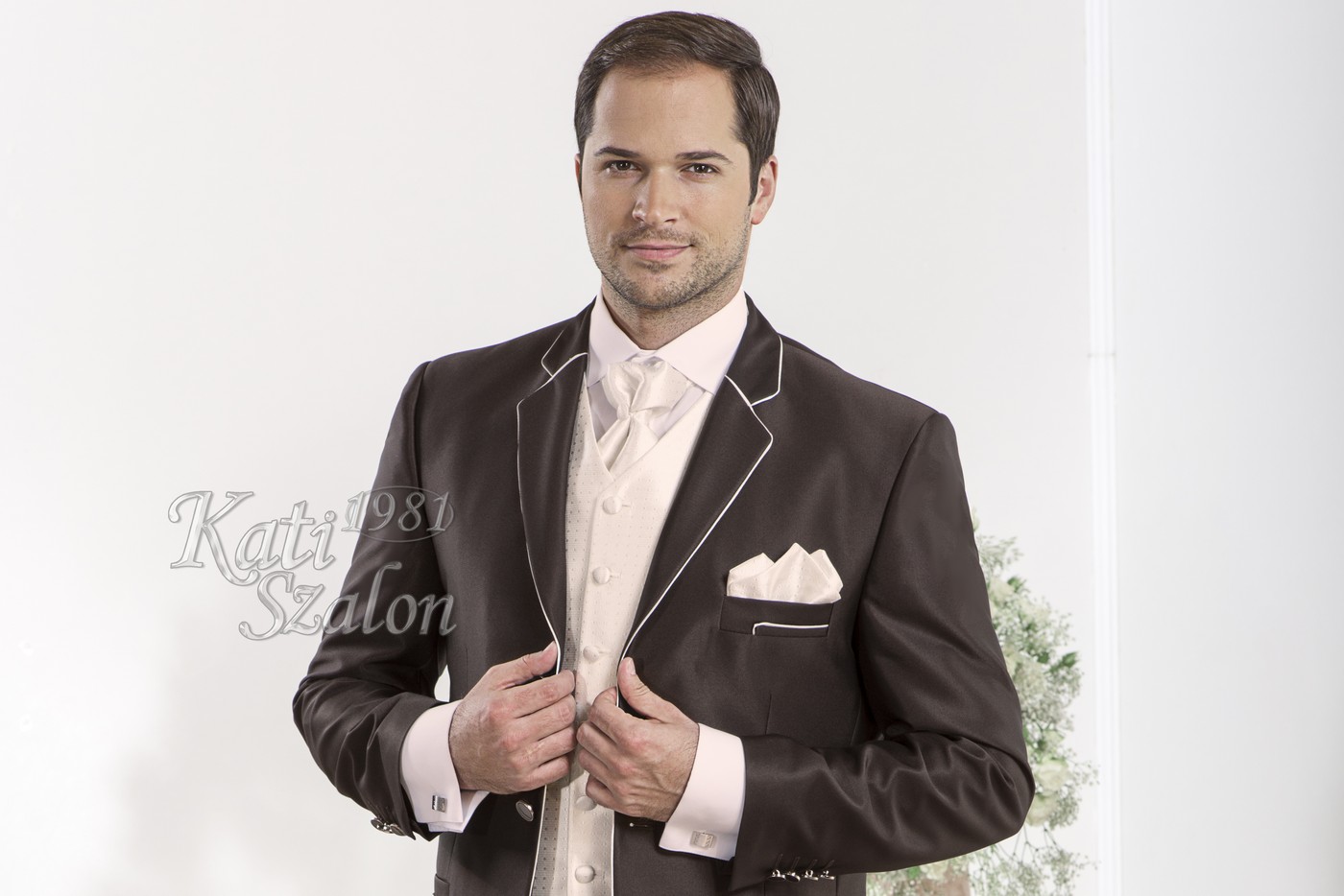 Sötétbarna egyedi férfi öltöny, különlegessége a vékony világos színű paszpol, ami kiemeli a zakó fazonját és zsebeit. A díszítés színével megegyező ceremónia mellénnyel elegáns viselet.