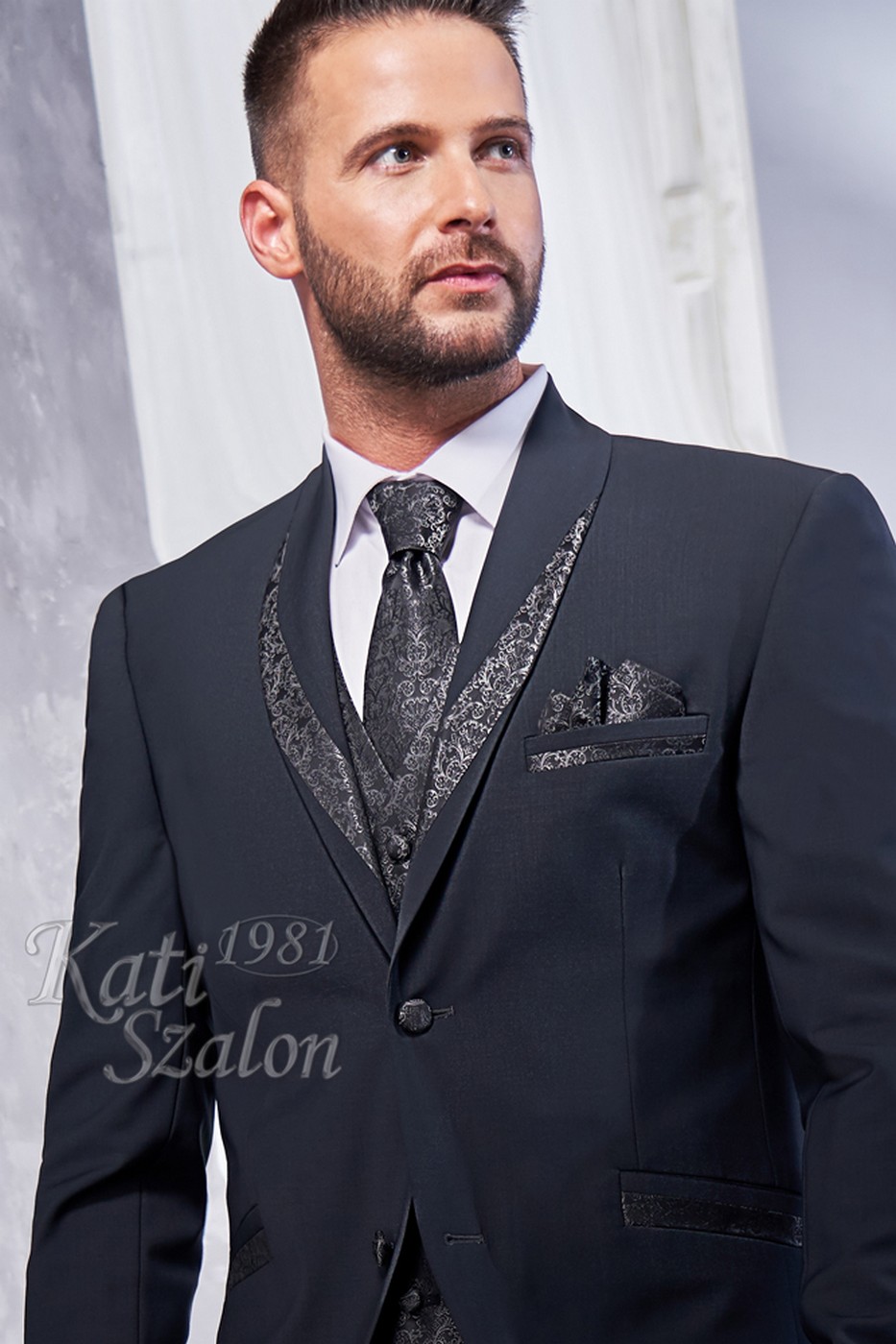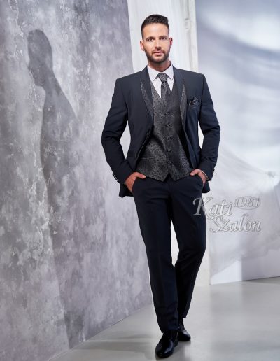 Szürke gyapjú 2 gombos öltöny. Elegáns sálgalléros fazon, a ceremónia mellénnyel megegyező díszítéssel, különleges, ünnepi viselet.