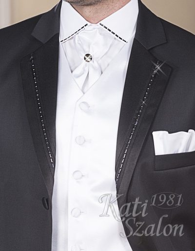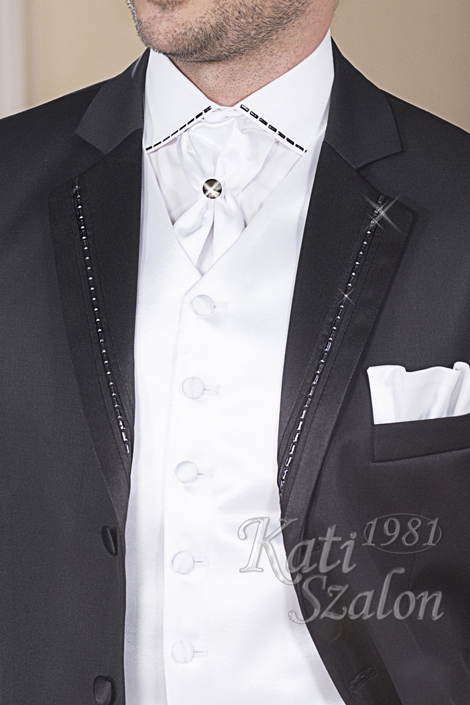 Elegáns fekete gyapjúból készült vőlegény öltöny. A fazon különlegessége a több részből szabott bezec, amit apró Swarovski kövek díszítenek. Nem hivalkodó, eleganciát tükröző egyedi modell.
