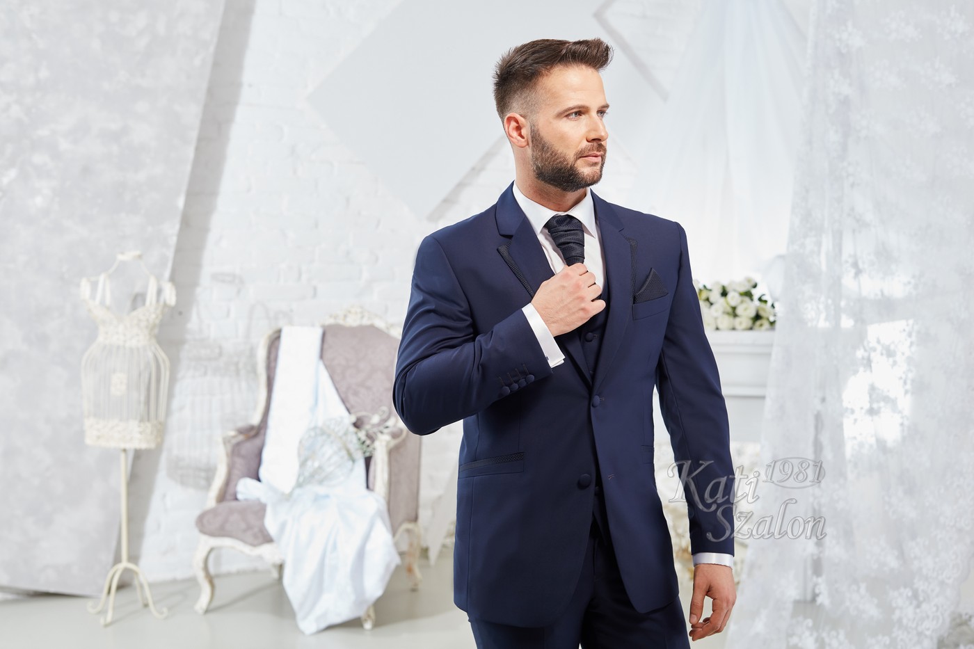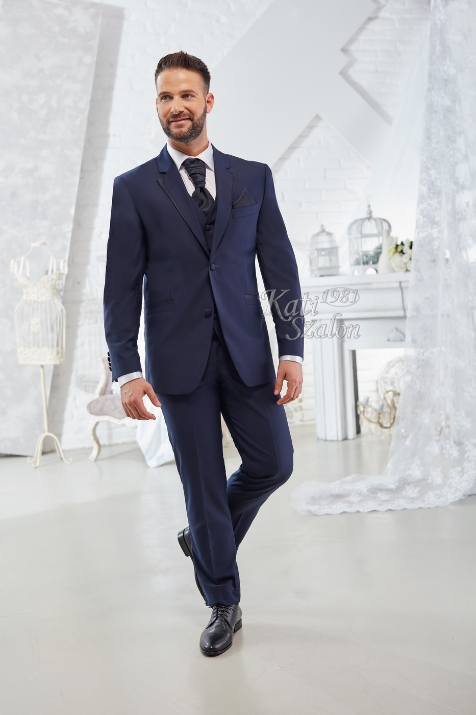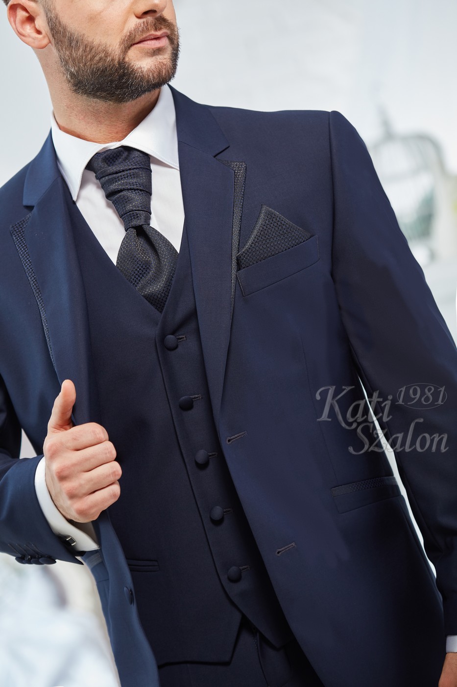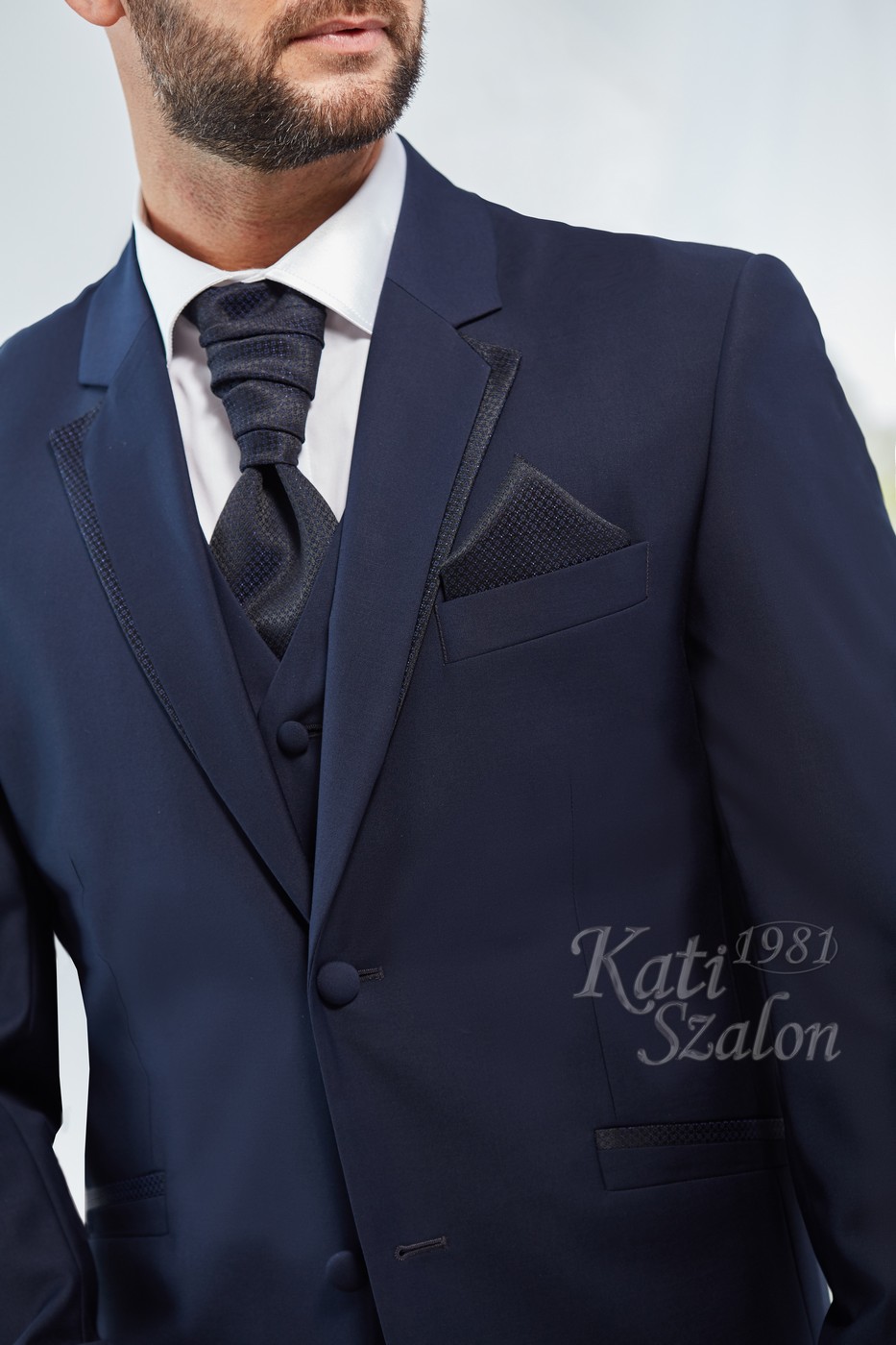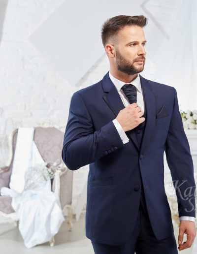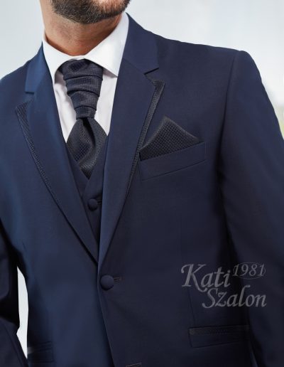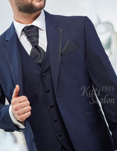 Sötétkék gyapjú vőlegény öltöny. A zakó különlegessége a bezec szabásán lévő mintás brokát, ami a nyakkendő és díszzsebkendő anyagával megegyezik.