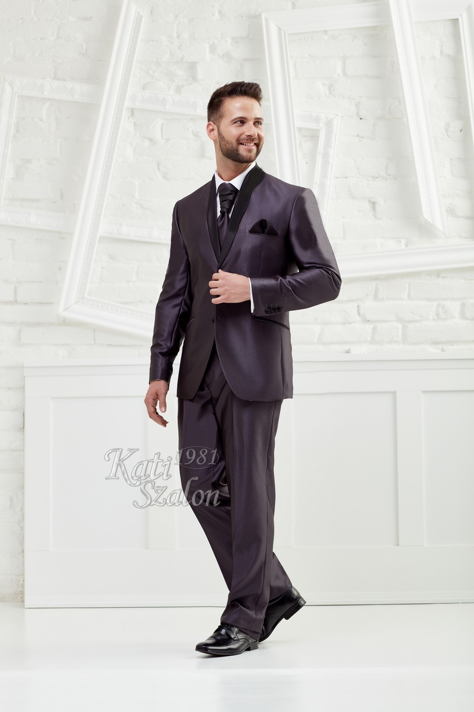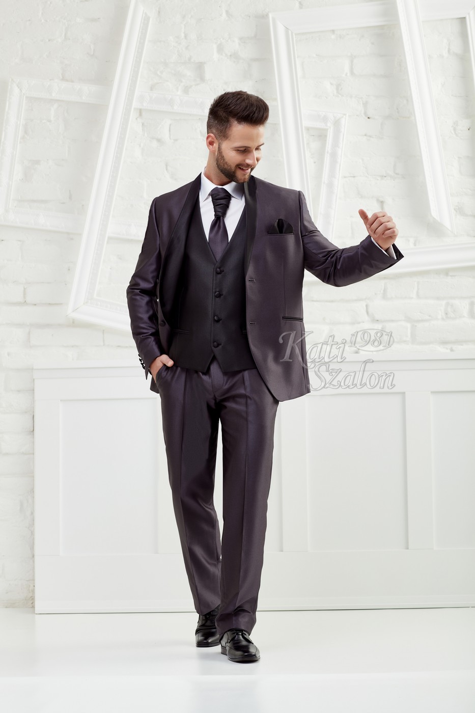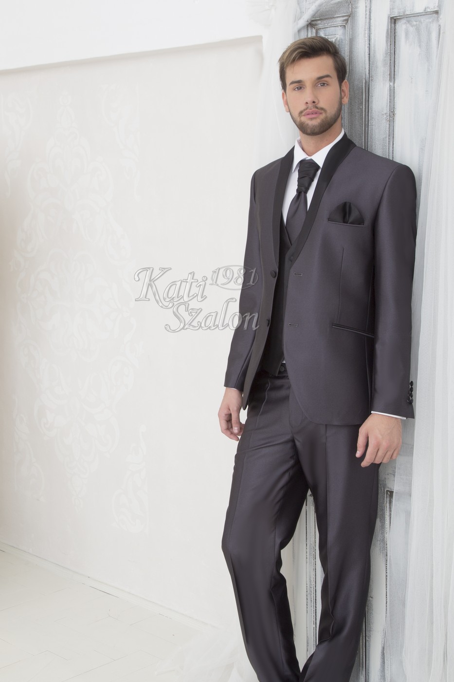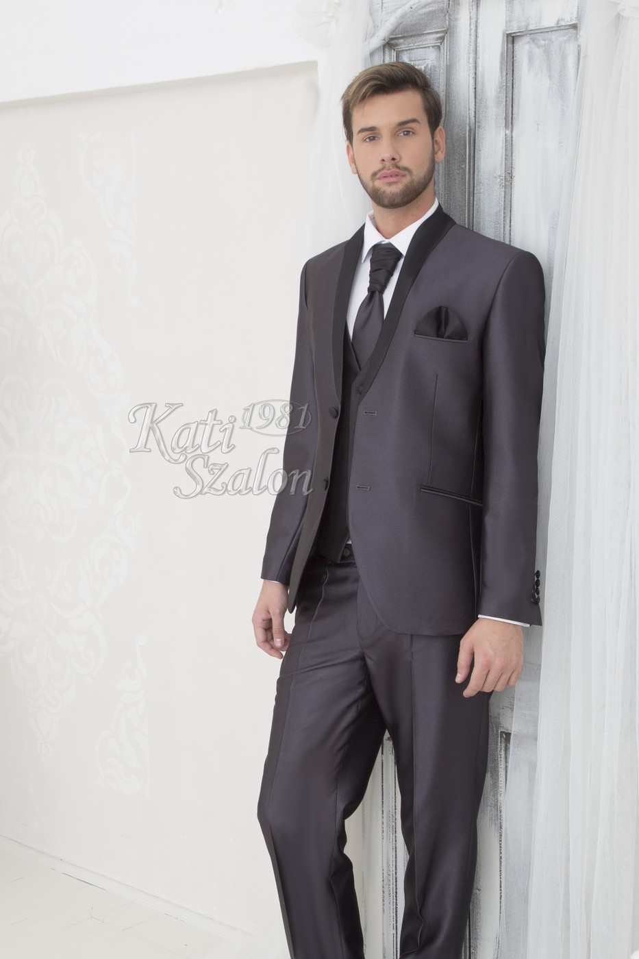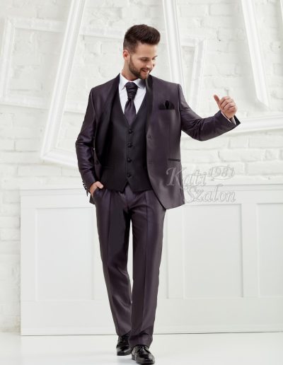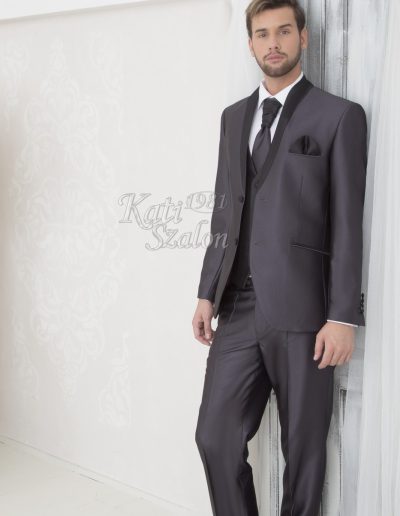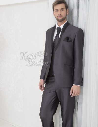 Egyedi tervezésű férfi öltöny. A szürke fényes anyagú öltöny állógallérjának íves fazonját a fekete anyag hangsúlyozza. 2 gombbal záródik. Mellénnyel, francia nyakkendővel, díszzsebkendővel kiegészítve.