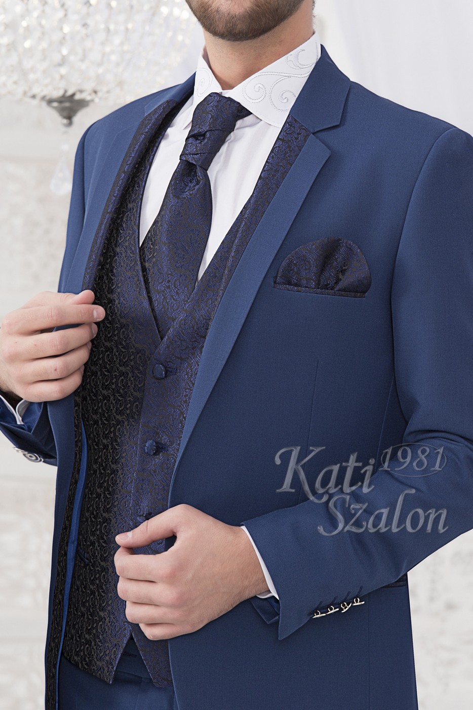 Sötétkék karcsúsított férfi öltöny, különleges brokát díszítéssel, díszgombokkal.