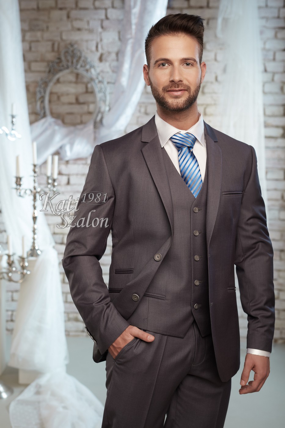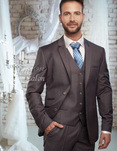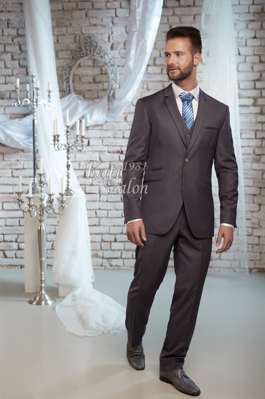 Slim fit gyapjú öltöny. Klasszikus fazonú 2 gombos férfi öltöny, dupla zsebbel, mellény az öltöny anyagából.