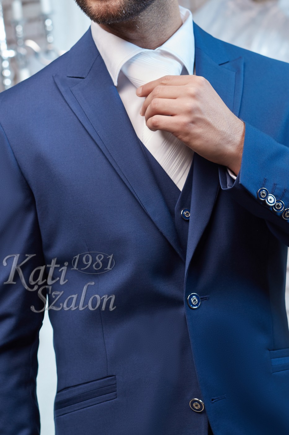 2 gombos gyapjú férfi öltöny egyediségét az ék alakban szabott bezec adja. Több részből szabott zseb egészíti ki. A mellény anyaga megegyezik az öltöny gyapjú anyagával.