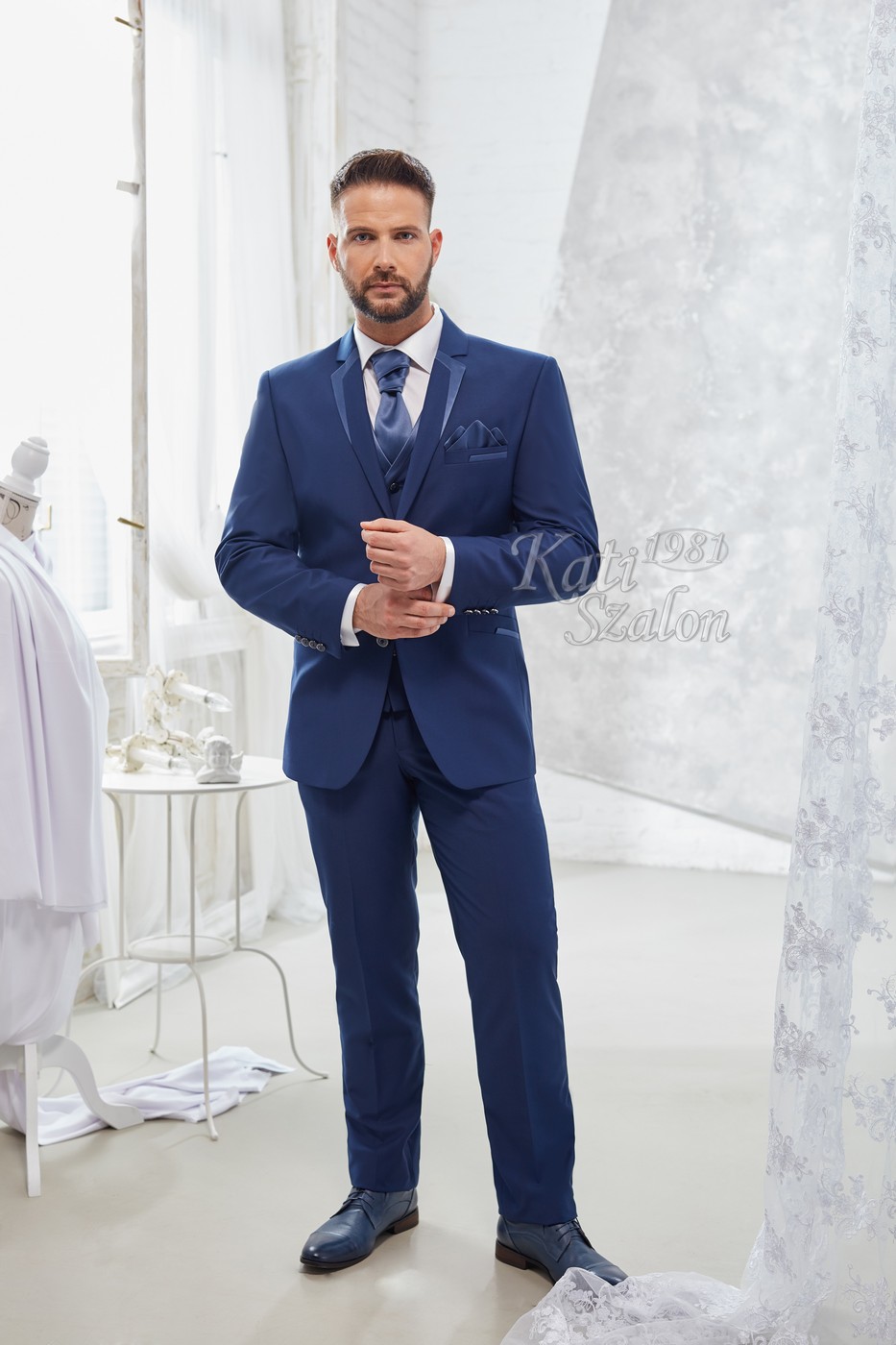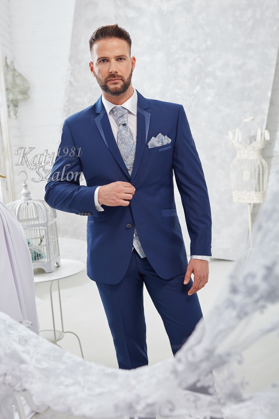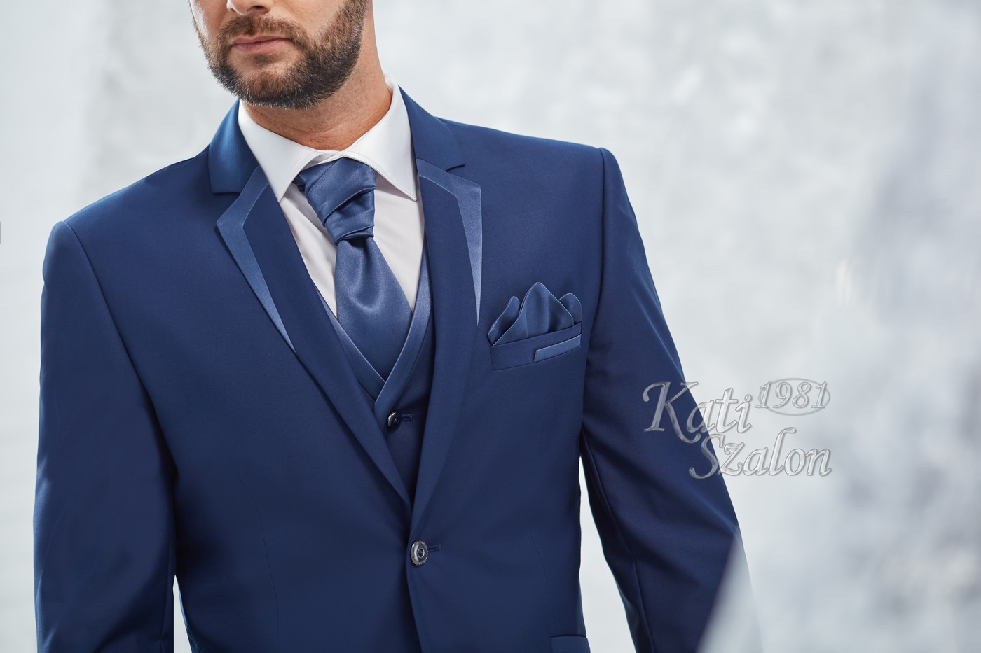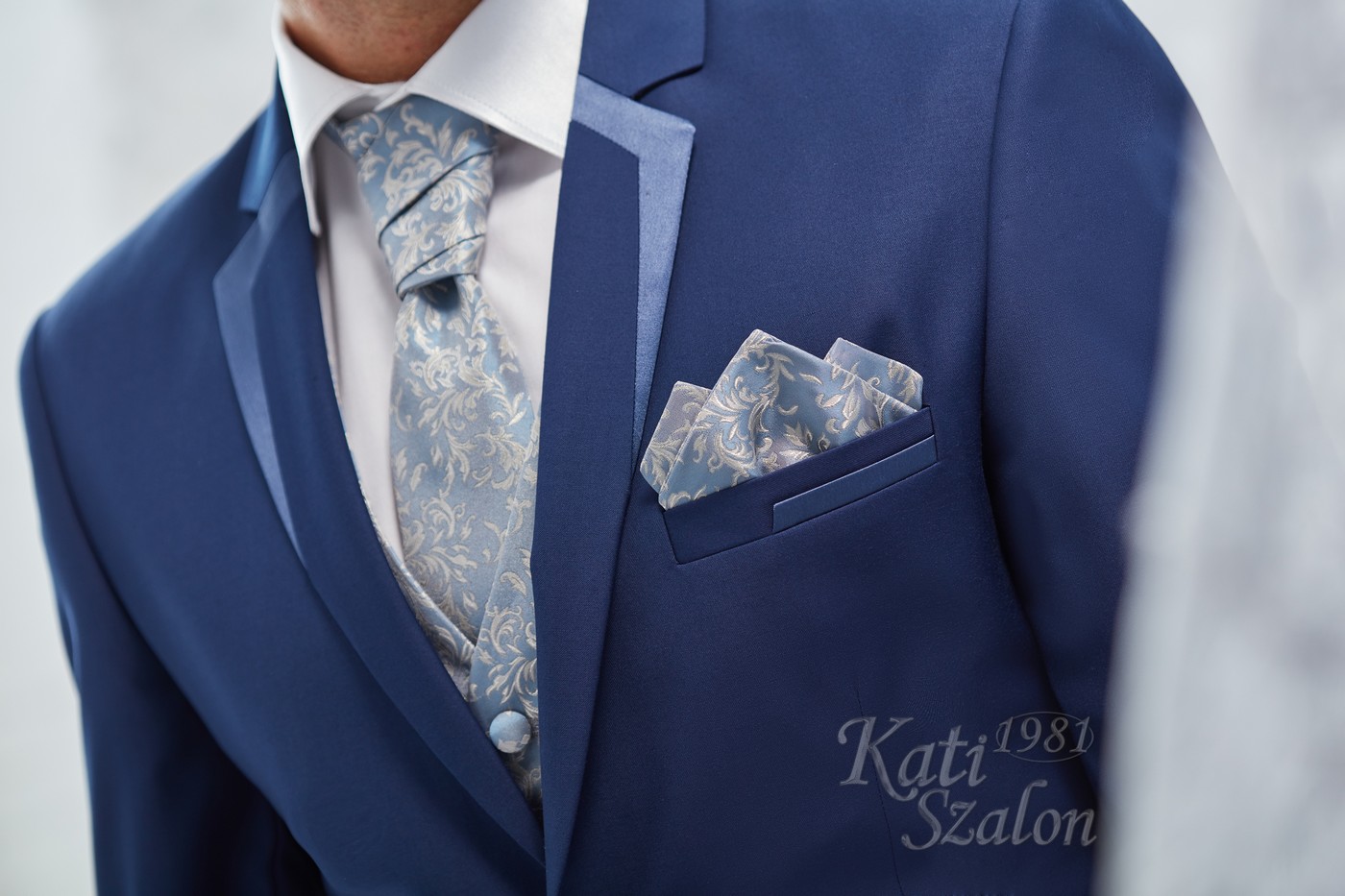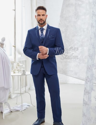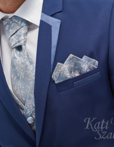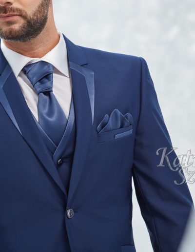Középkék gyapjú öltöny. Egyediségét a szabott szaténnal díszített bezec adja. A mellény díszítése, a nyakkendő és a díszzsebkendő a zakó díszítésével harmonizál.
