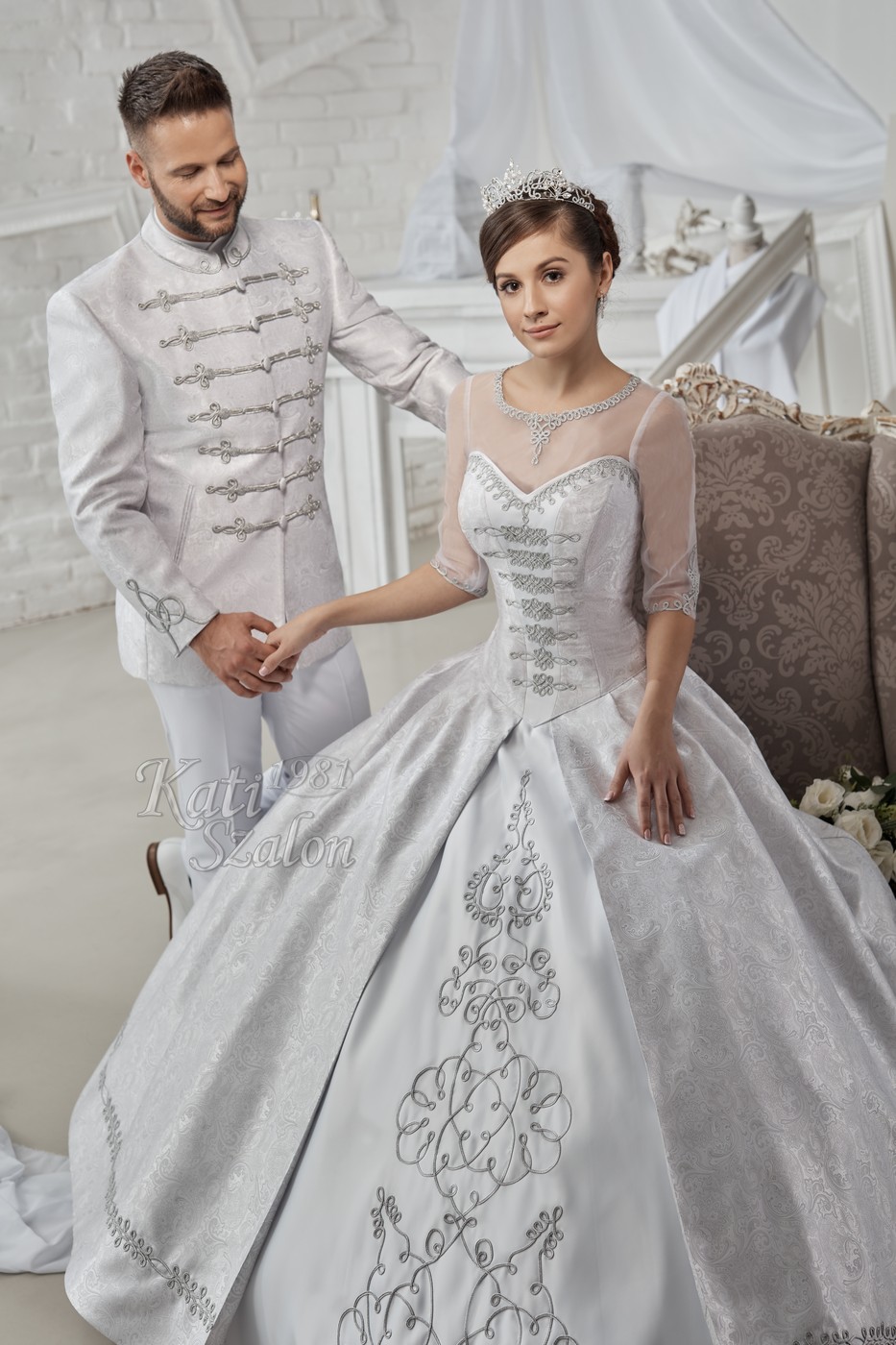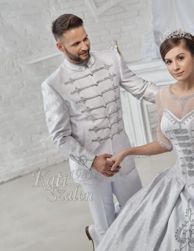 190 Esküvői ruha – Ezüst sujtásos brokát bocskai