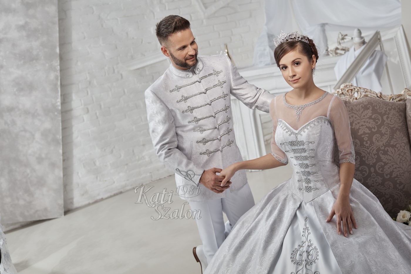 A menyasszonyi ruha különleges brokát anyaga a vőlegény bocskai zakójával megegyezik.A hagyományos magyar motívumok ezüst sujtás díszítéssel jelennek meg.