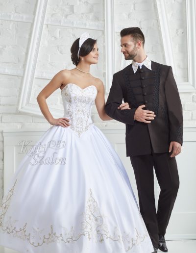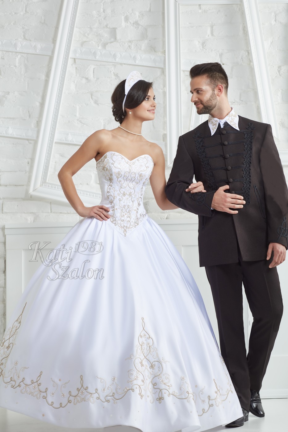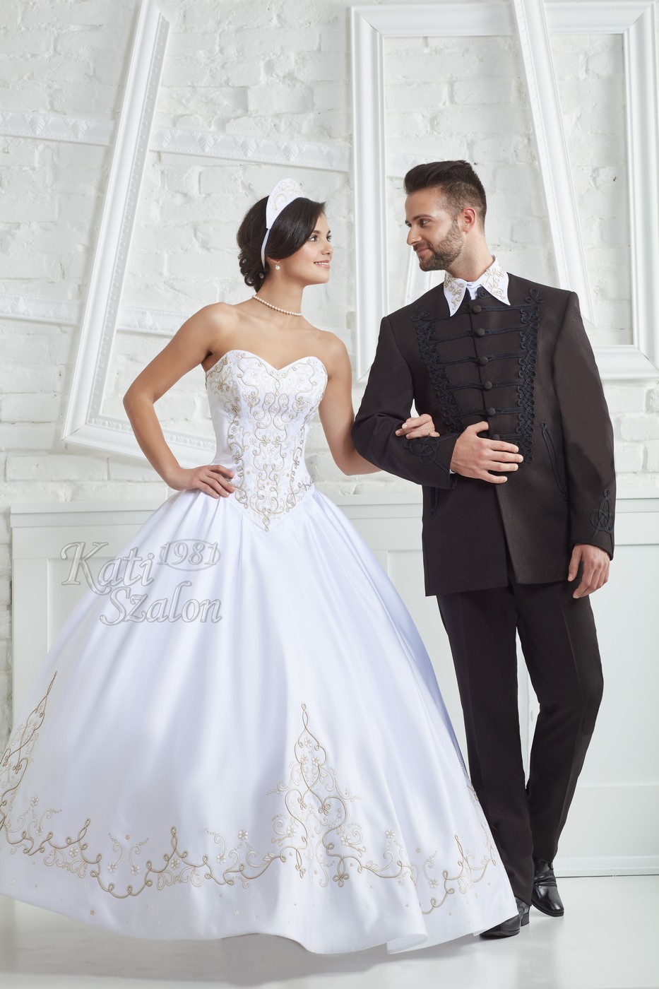 Különleges, egyedi matt szaténból készült esküvői ruha. Arany-fehér hímzés és hozzá illő sujtásmotívum díszíti. Hagyományos fekete bocskaival készült.