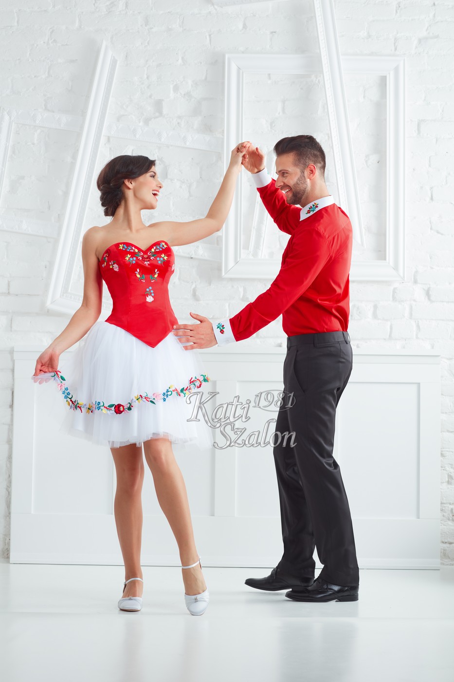 Vidám, tüllös kalocsai mintás menyecske ruha. A férfi ing fehér gallérja és mandzsettája kalocsai hímzéssel díszített.