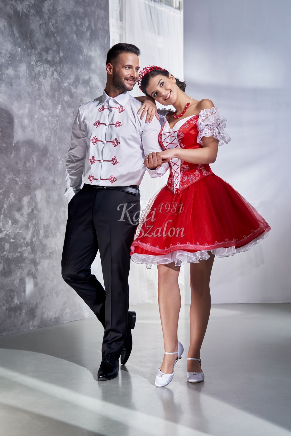 Vagány, rövid tüll szoknyás menyecske ruha piros-fehér színben. A férfi ing mintája és színe hozzá illő.