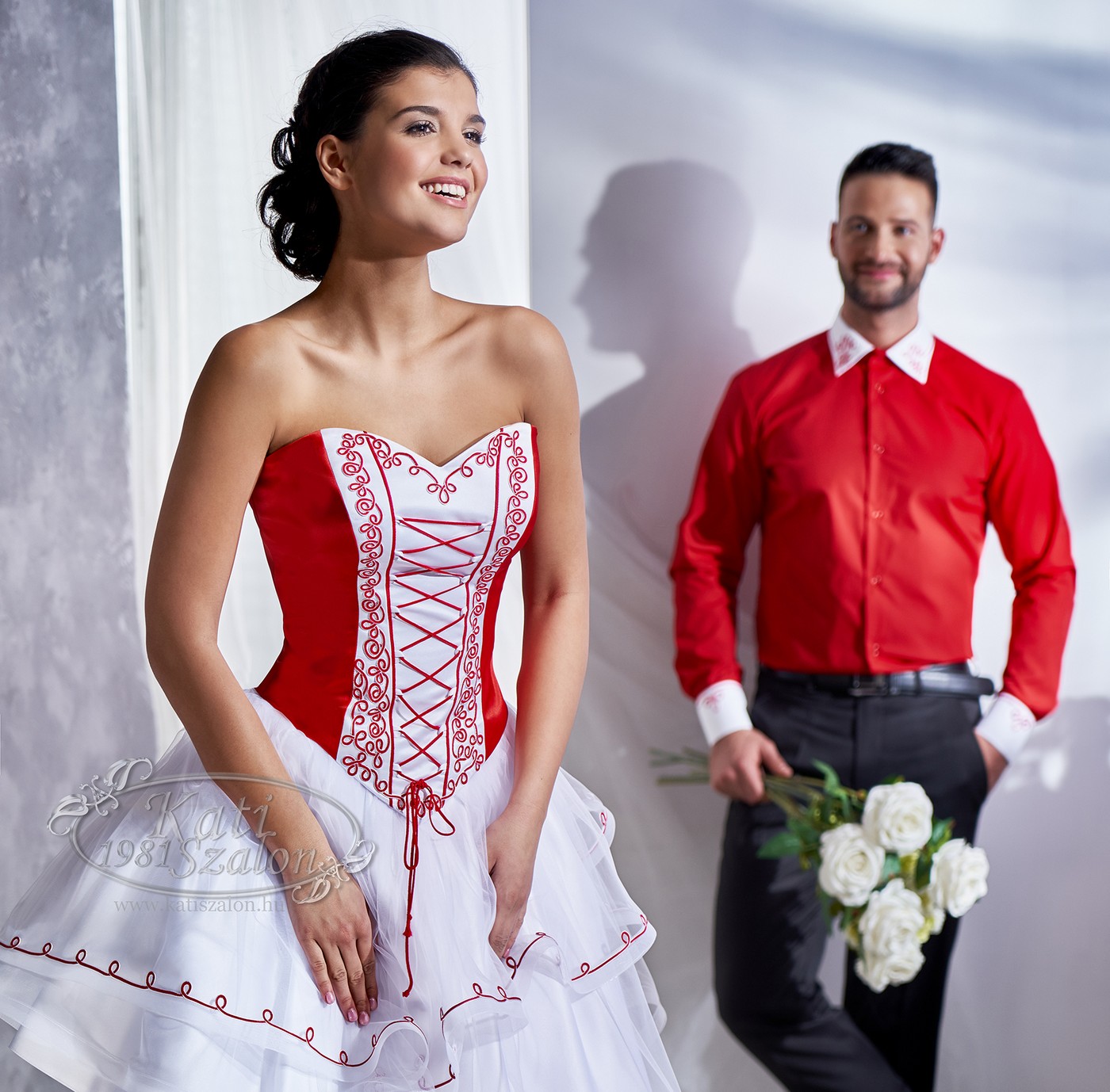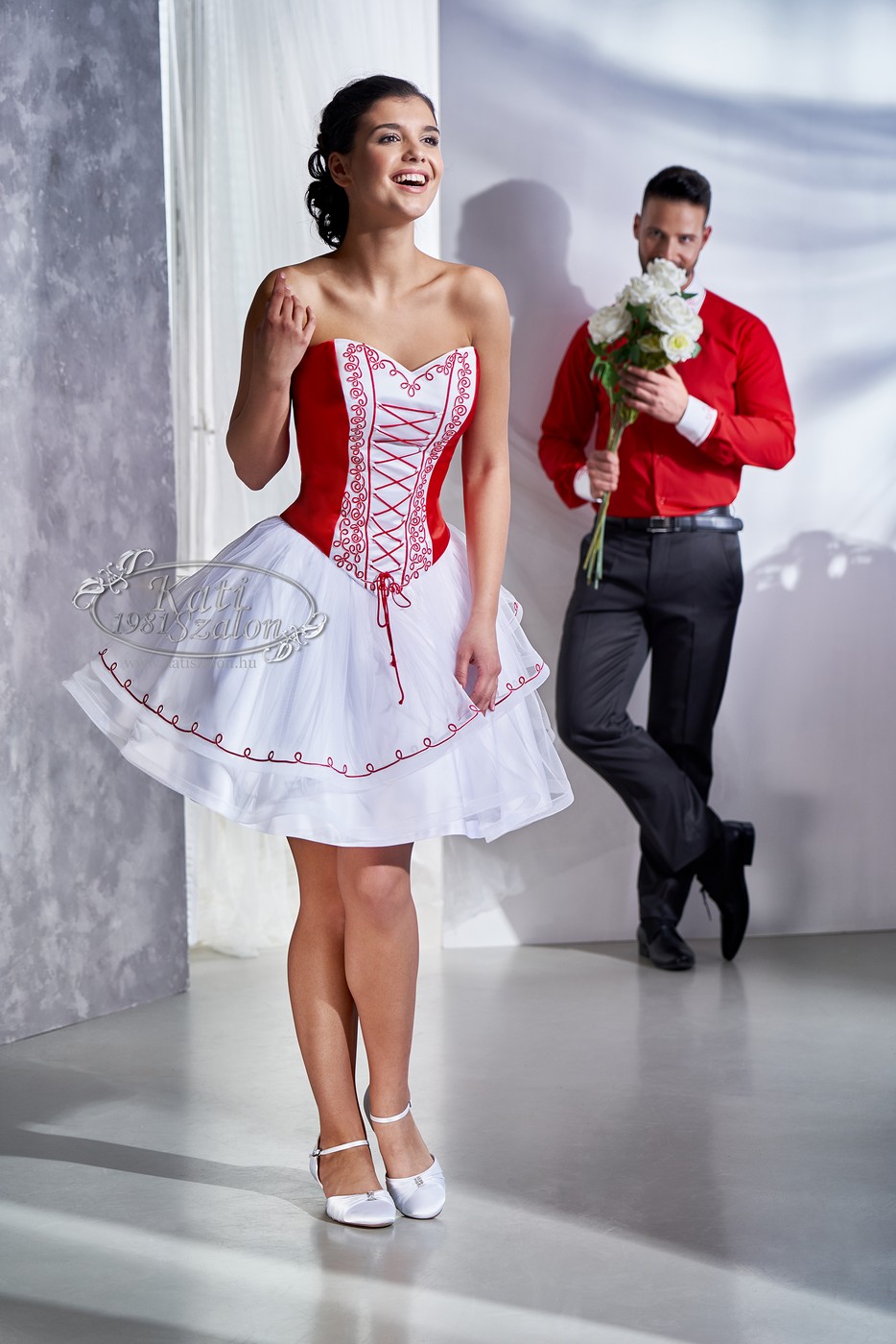 Fehér, tüllös szoknyás zsinóros menyecske ruha, felsőrésze elöl fűzős. Egyedi piros-fehér sujtással díszített újember inggel.