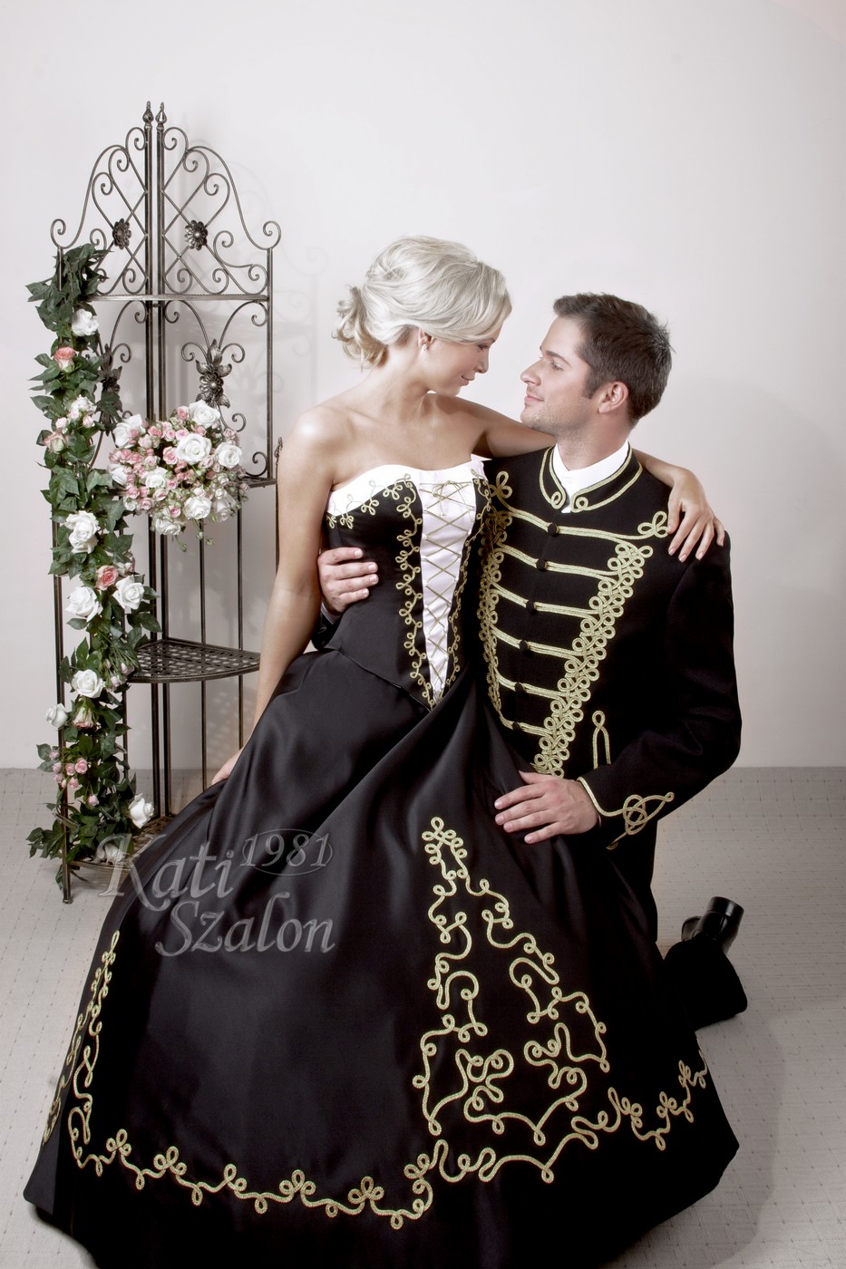 Fekete-arany díszítésű elegáns, hosszú menyecske ruha és hozzá illő bocskai öltözék.