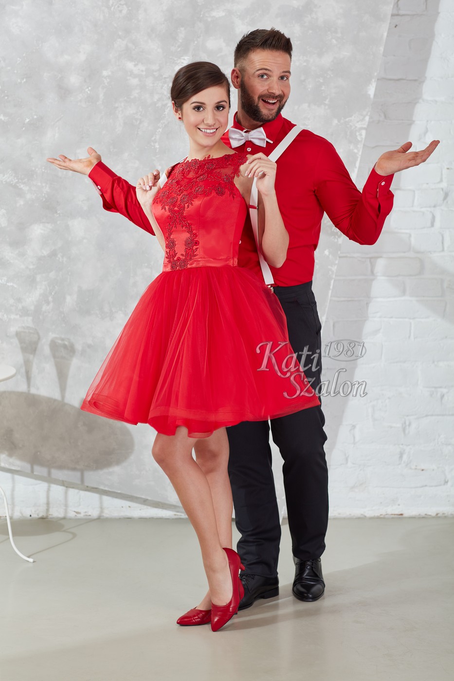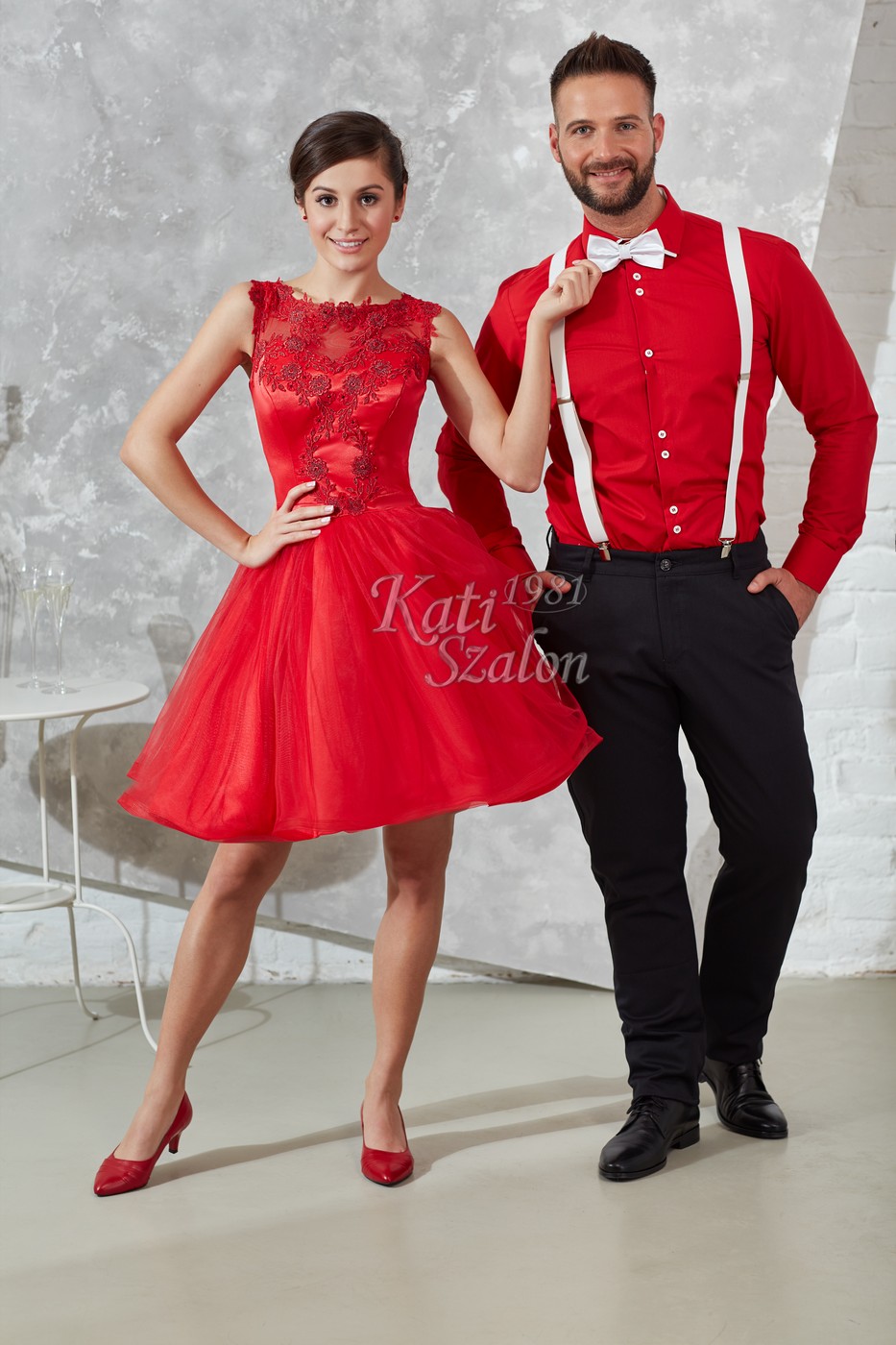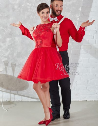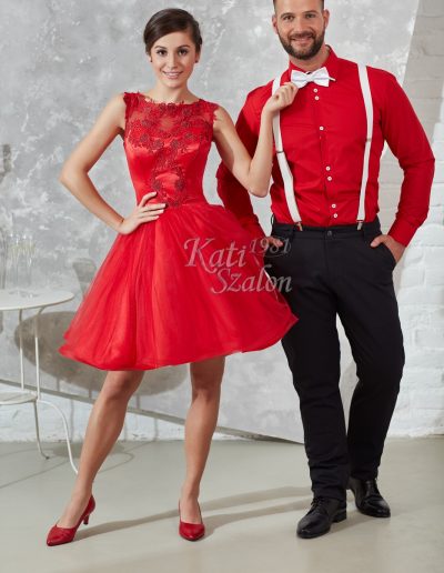 Fiatalos menyecske ruha, pörgős szoknyával. A fehér hózentróger és csokornyakkendő piros inggel kiváló választás mellé.