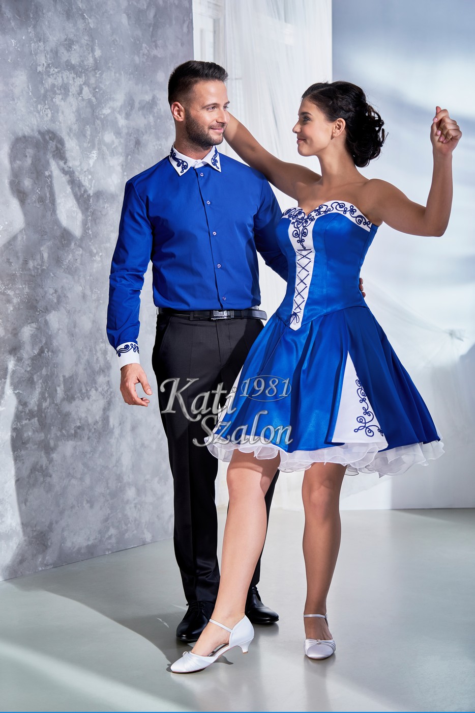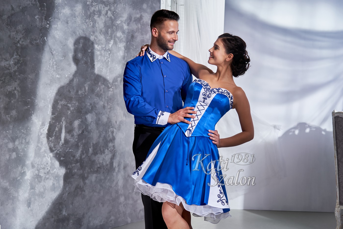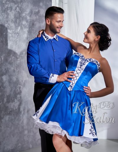 Különleges fehér betétes szoknyával készült királykék menyecske ruha. A férfi ing királykék-fehér színösszeállításban is kérhető.